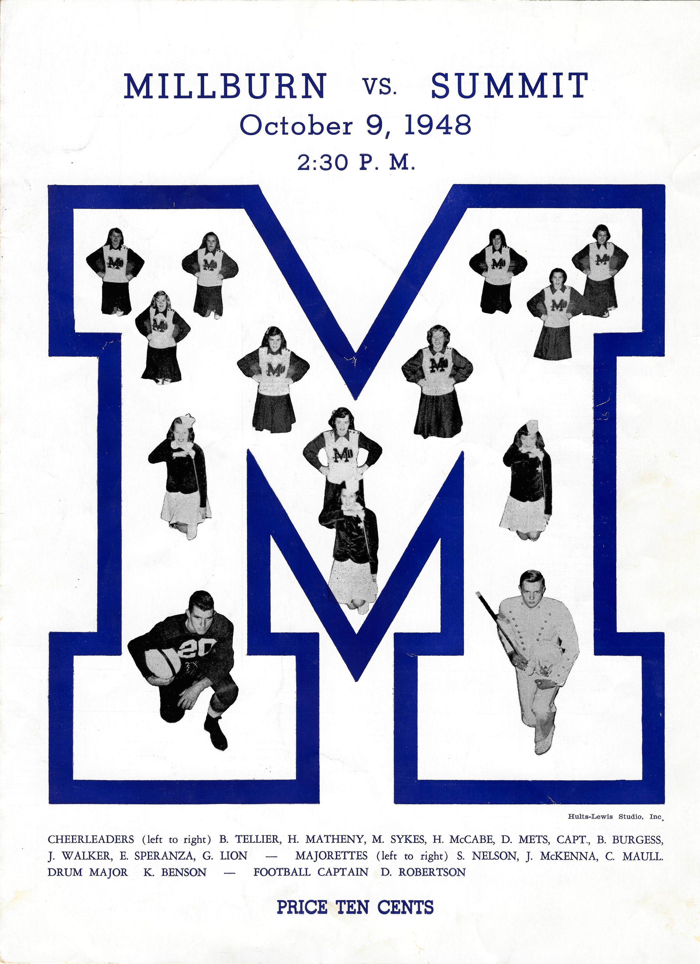 Illustrated Program for the October 9, 1948 Football game between Millburn High School and Summit High School. 4 pp. Contains list of players, captains, team line-up, band, 1948 Football Schedule and notice for the Official Dedication of the Millburn Athletic Field on November 25, 1948. Illustrated with photographs and advertisements for Investors Savings & Loan Association and Muir's Department Store in East Orange.Acquisition