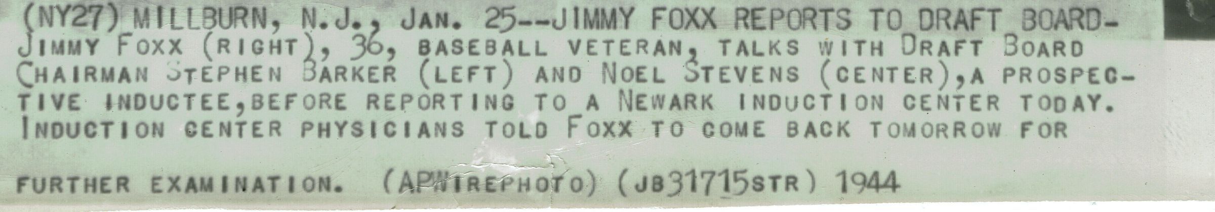 Associated Press Wire photograph of Baseball Hall of Fame player Jamie Foxx reporting to the Draft Board in Millburn, NJ in January 1944. Foxx had moved to Millburn in 1943.