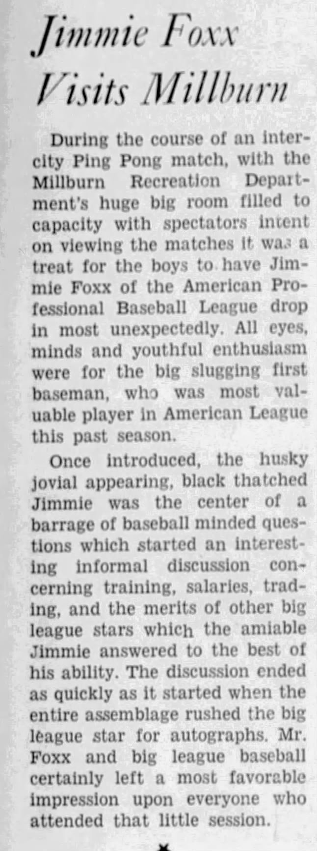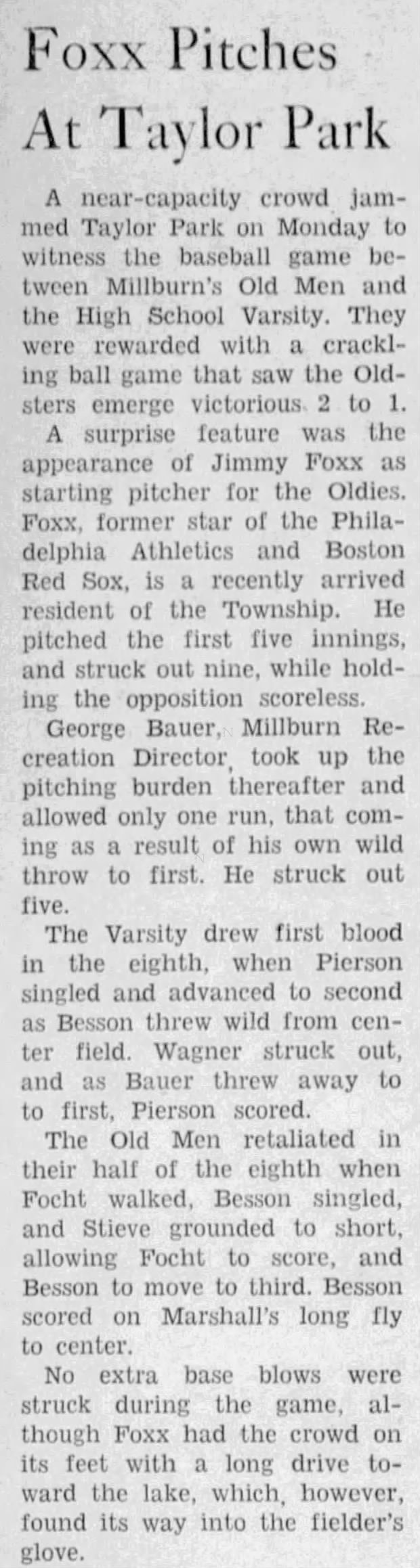 Foxx came to Millburn before his marriage here to Dorothy Yard in June 1943. He played in some games with local teams, including a "surprise" appearance as the pitcher for "Millburn's Old Men" in a game against the Millburn High School team. (He pitched five innings, and was followed on the mound by George Bauer, the longtime Township recreation director.)