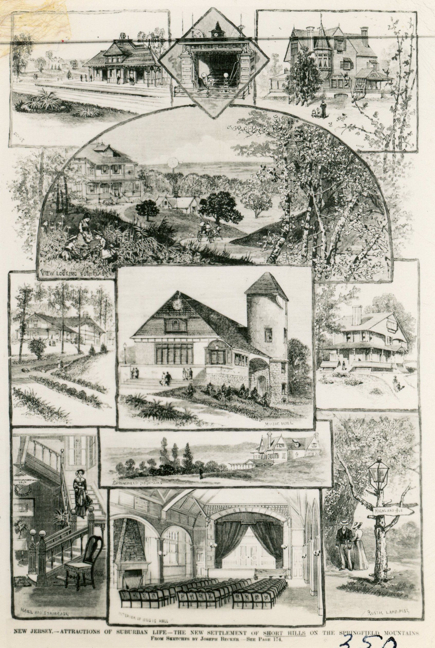 Frank Leslie's Illustrated Newspaper was a highly successful weekly illustrated paper published from 1855-1922, focusing on timely, newsworthy events of the week. Frank Leslie's Views of Short Hills, featured the new Stanford White Music Hall, which had just been completed and was highlighted in other publications at the time. Other views include: The Short Hills Train Station; Highland Ave. Sign; 40 KnollwoodAcquisition