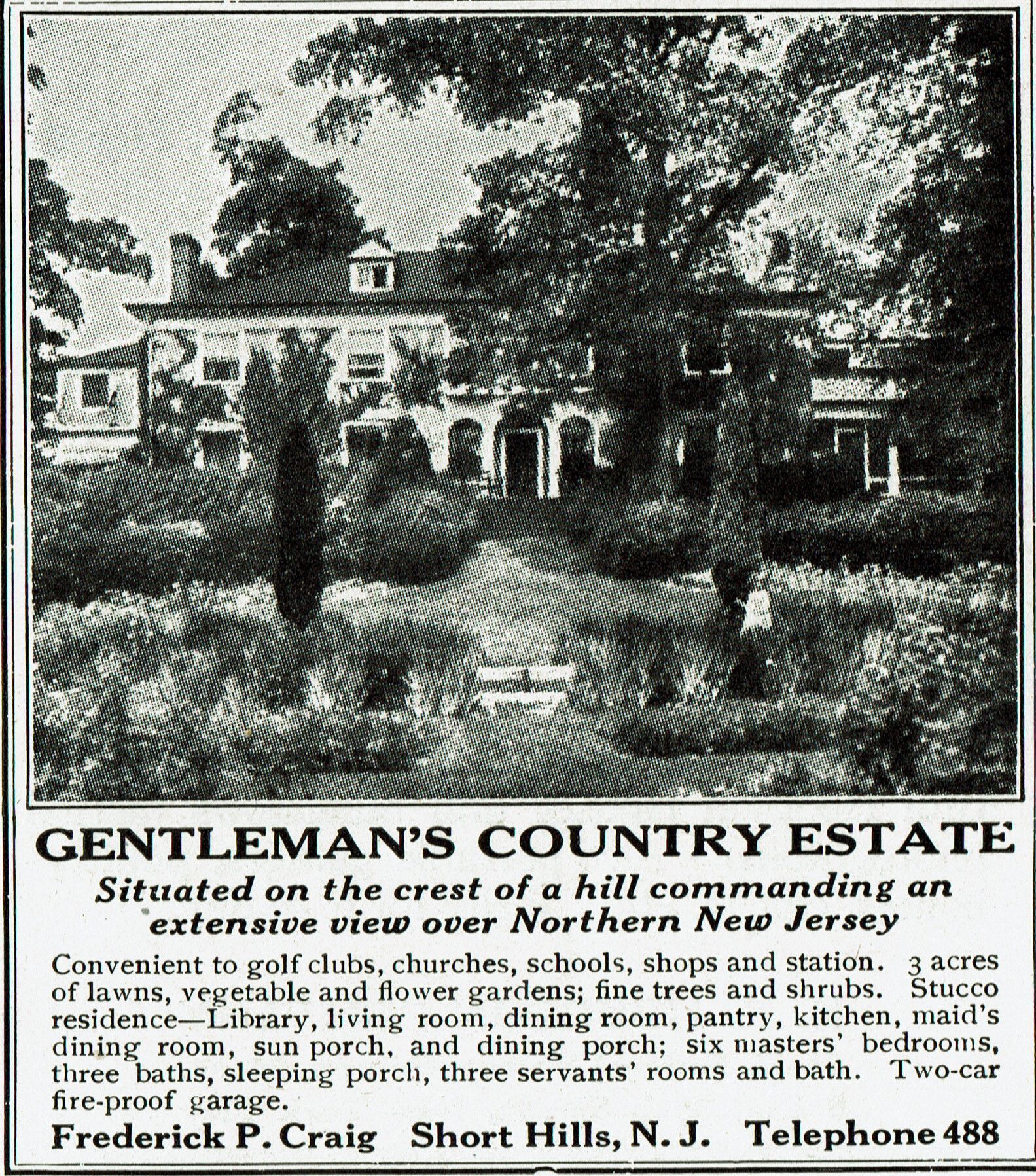Frederick Craig Real Estate Advertisement for Short Hills home , c. 1923Entry/Object ID