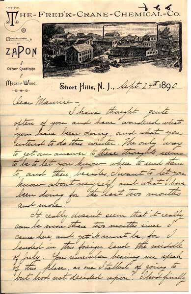 Three-sheet (six-pages) letter with the Frederick Crane Chemical Company letterhead -- and the envelope. Written by a chemist-employee to a friend in Philadelphia PA. The stationery has "Short Hills, N.J." printed on it, but according to some Internet info from the seller, the firm was in Springfield, NJ. The Celluloid Zapon Plant was located in on Morris Avenue in Springfield. It opened in 1888 and was one of two manufacturing plants in the area. It closed in 1904 and moved to Stamford Connecticut.Acquisition