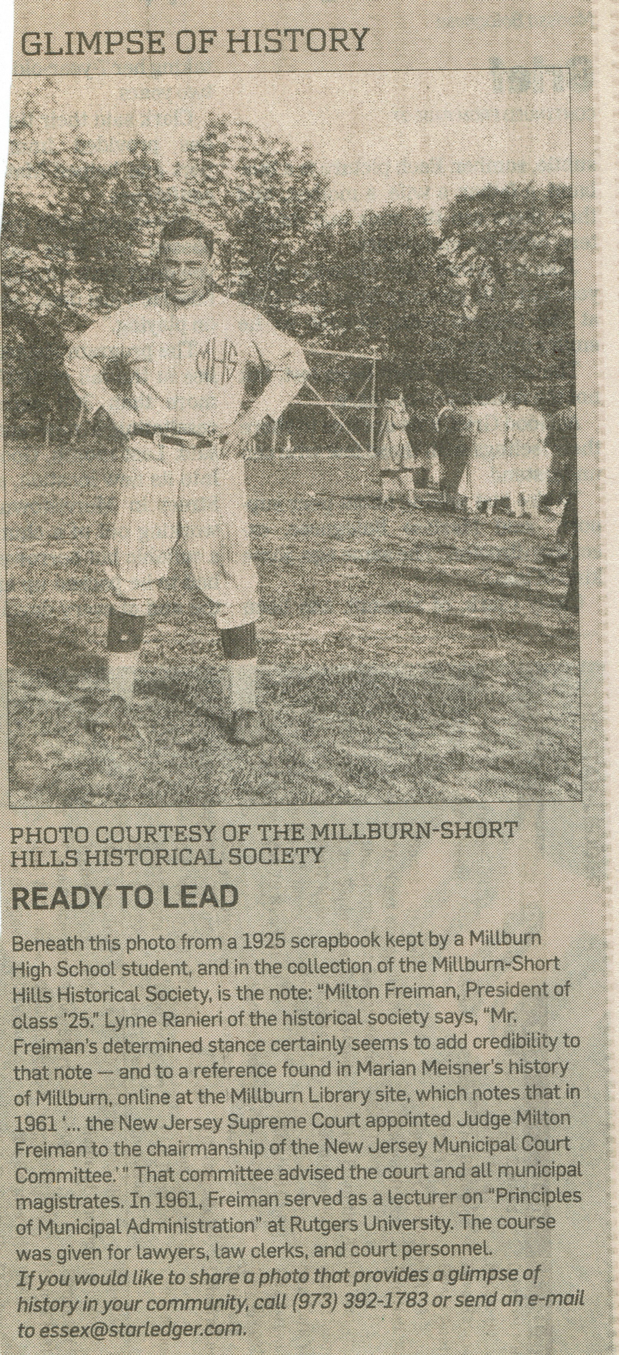 Clipping from the May 15, 2011 Edition of the Star-Ledger featuring a photograph of 1925 Millburn High School Class President Milton Freiman in a MHS Baseball Uniform. Milton Freiman went on to become chair of the New Jersey Municipal Court Committee.Acquisition
