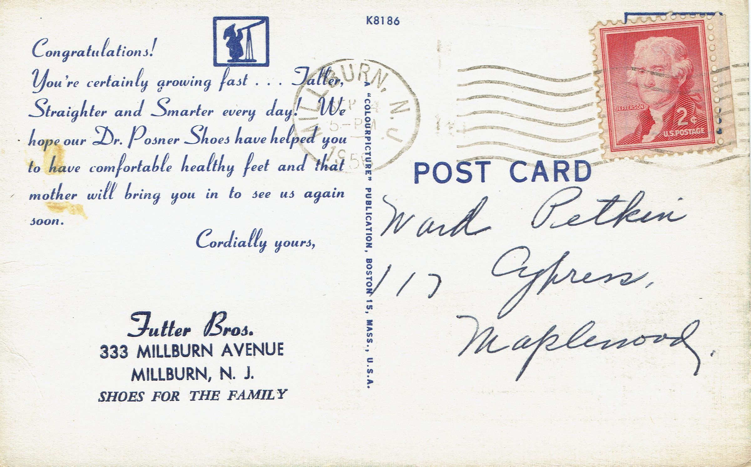 Postally used advertising postcard from Futter Brothers Shoe Store, 333 Millburn Avenue fearing Dr. Posner Shoes, postmarked Millburn, September 4, 1956. Card contains birthday greetings with a poem on the front. Verso contains message: Congratulation! You're certainly growing fast..Taller, Straighter and Smarter every day! We hope our Dr. Posner Shoes have helped you to have comfortable healthy feet and that mother will bring you in to see us again soon. Cordially yours, Futter Bros.