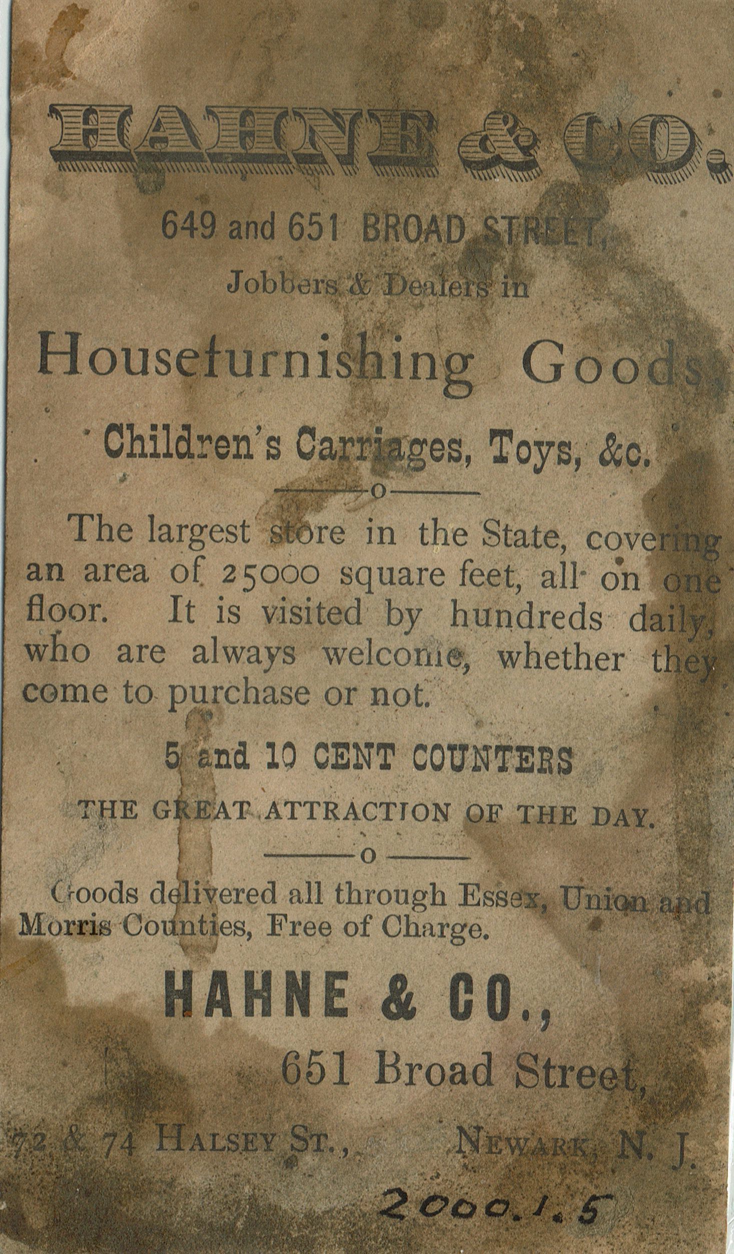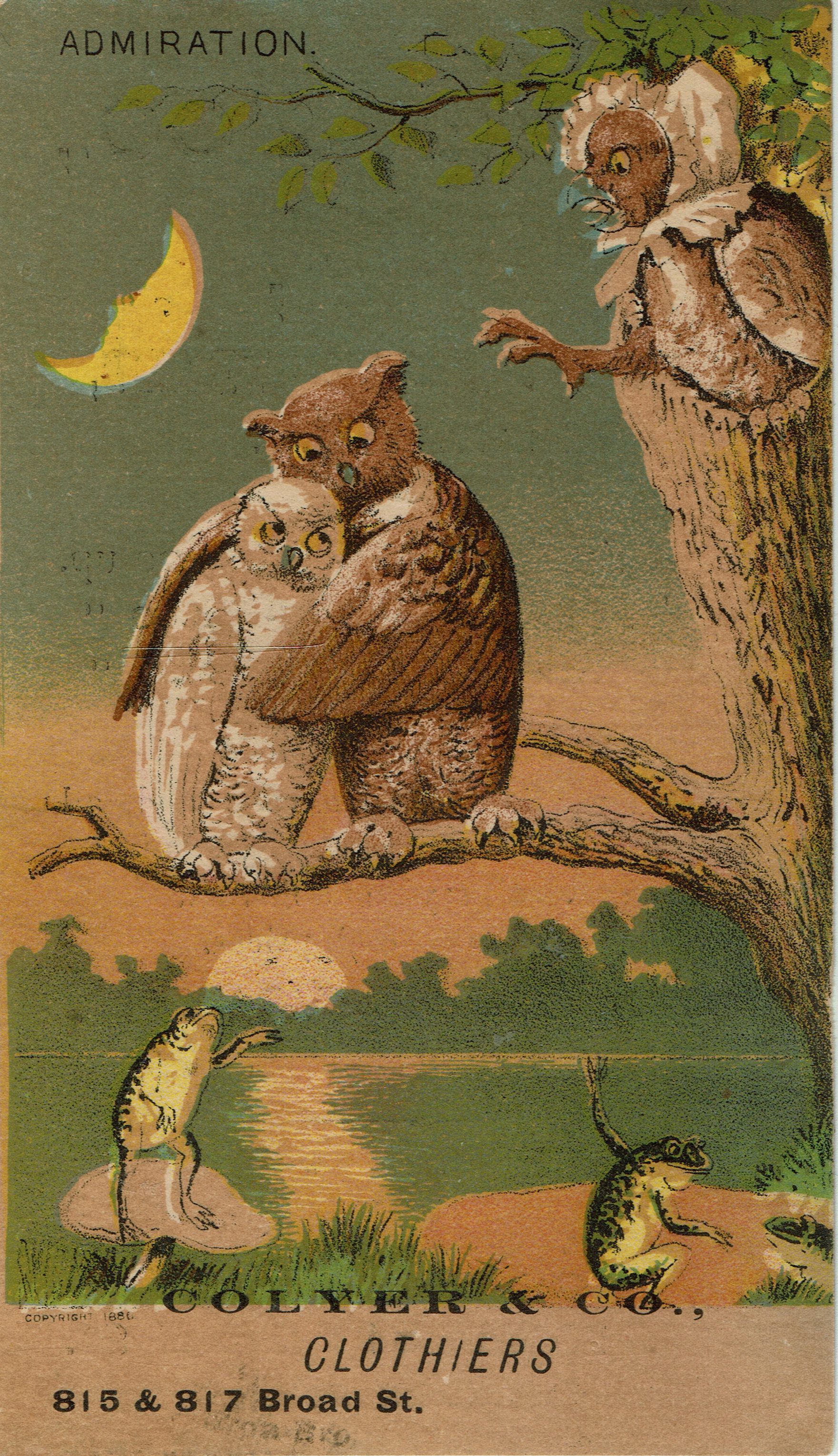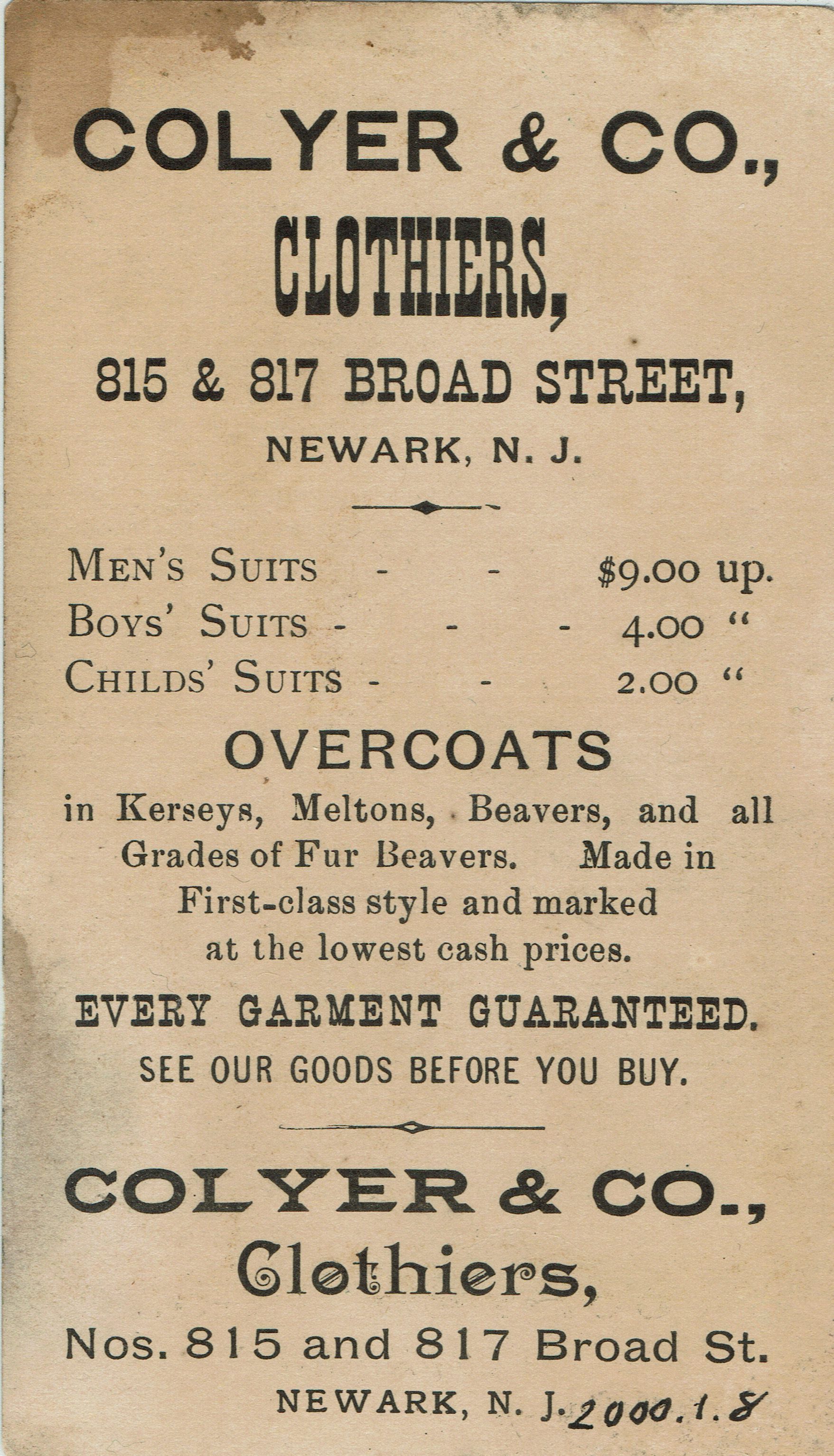 Advertising Cards from Crawford's Melrose Cigars (2), Ball & Company Clothing Store, Colyner & Company Clothiers, Hayne & Company Furnishings from the collection of Mary Gallitelli.Acquisition