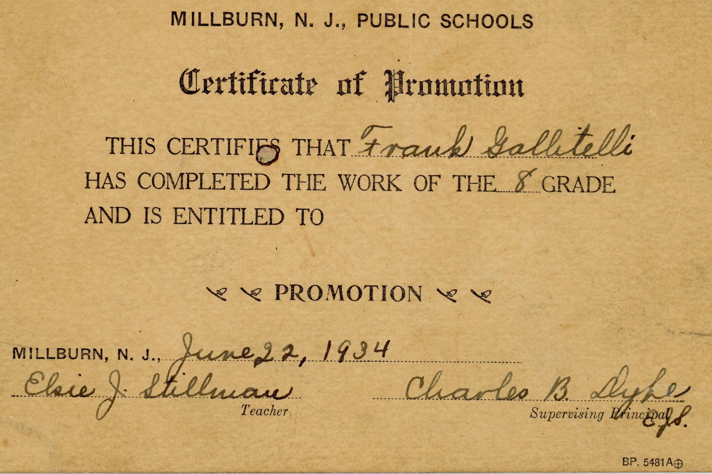 Report card for Frank Gallitelli from the Millburn Public Schools from 8th grade and certificate of promotion to 9th grade. Dated June 22, 1934 and signed by Elsie J. Stillman (teacher) and Charles B.Dyke (supervising principal). Double-sided card with grades recorded for Millburn Junior High School during the academic year 1933-1934.