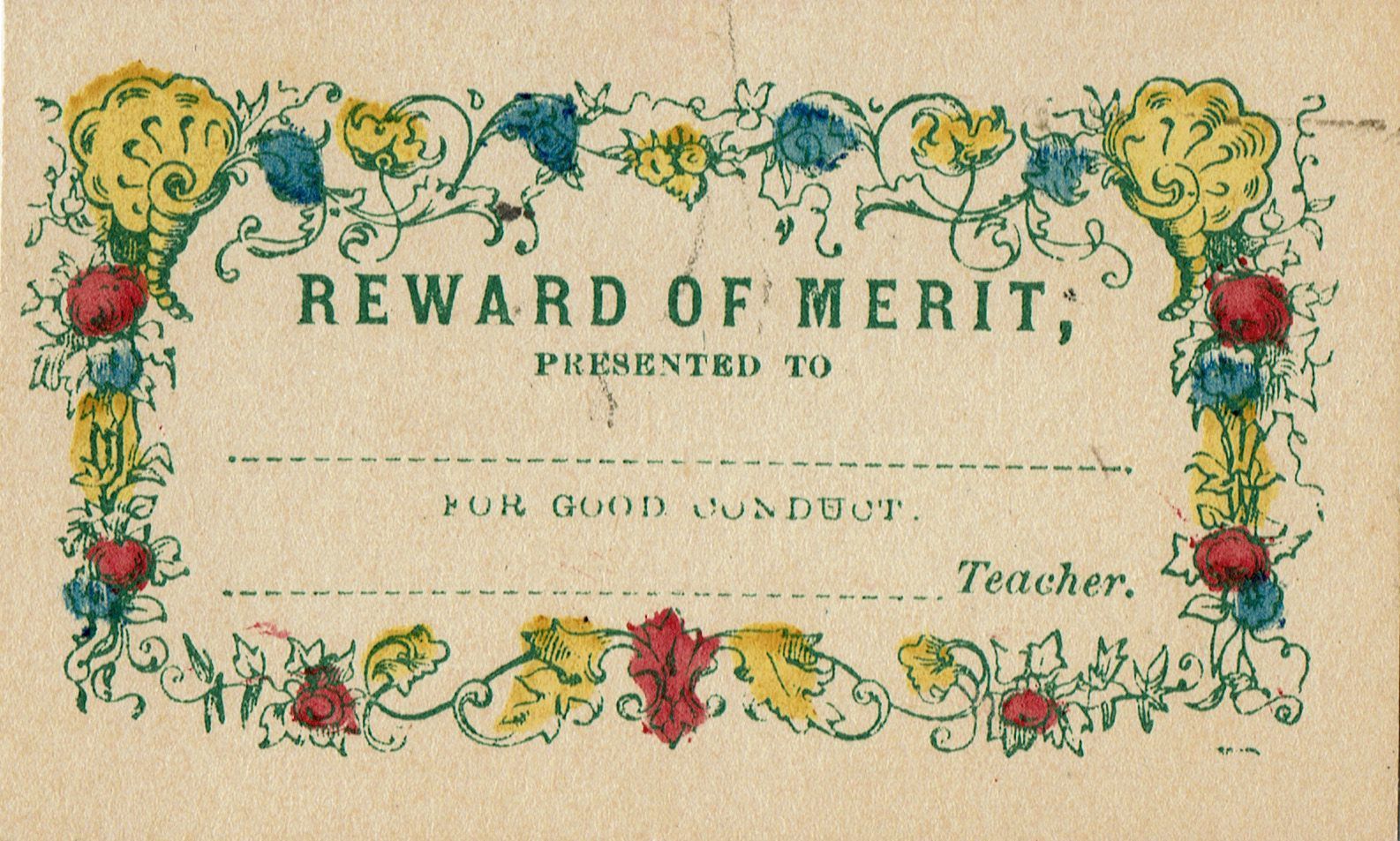 Rewards of Merit cards and flower cards: Reward of Merit card Presented to Mary Laittle, Reward of Merit card (blank), 2 Flower cards (same design) from the collectio of Mary Gallitelli.Acquisition