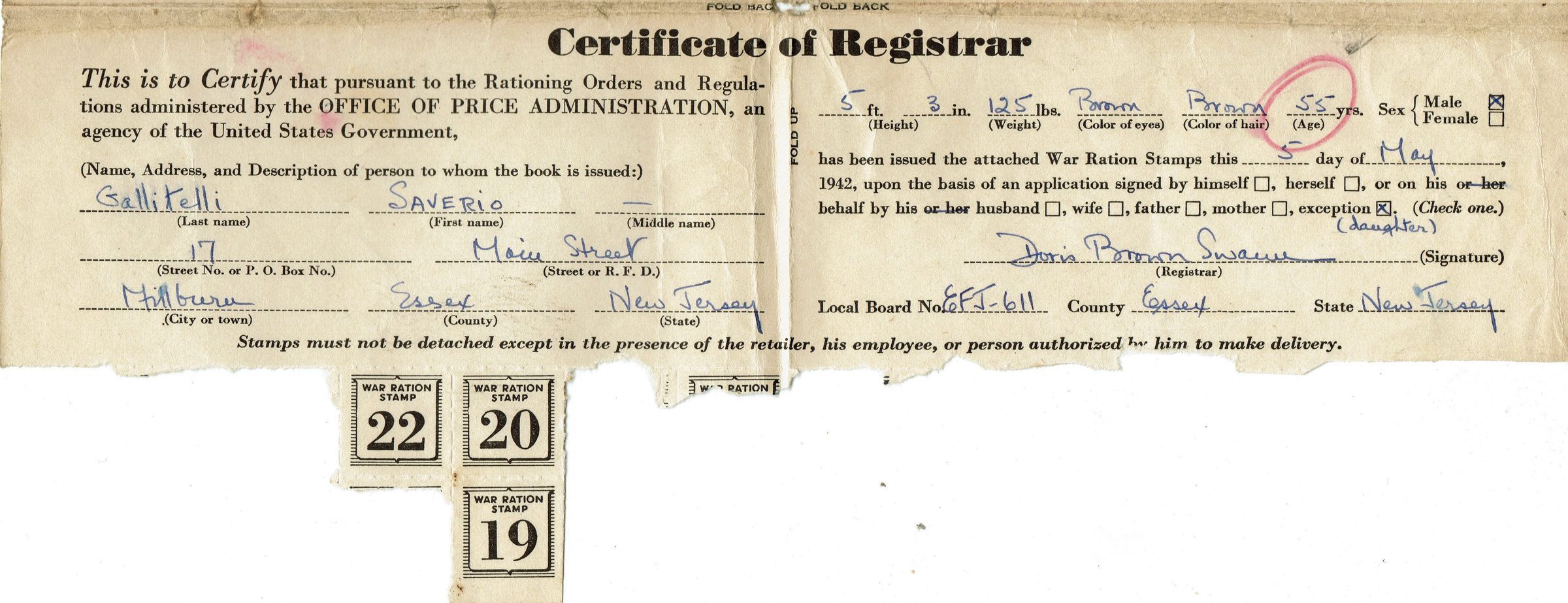 War Ration Book One issued to Saverio Gallitelli, 55 years old, 17 Main Street, Millburn, New Jersey on May 5, 1942. Book was signed for by Mary Peace Gallitelli (daughter).Acquisition