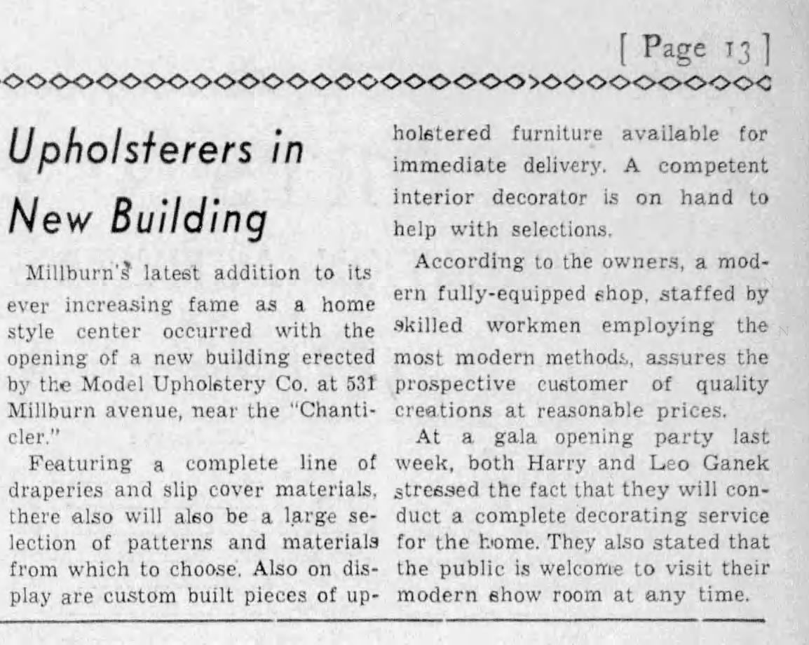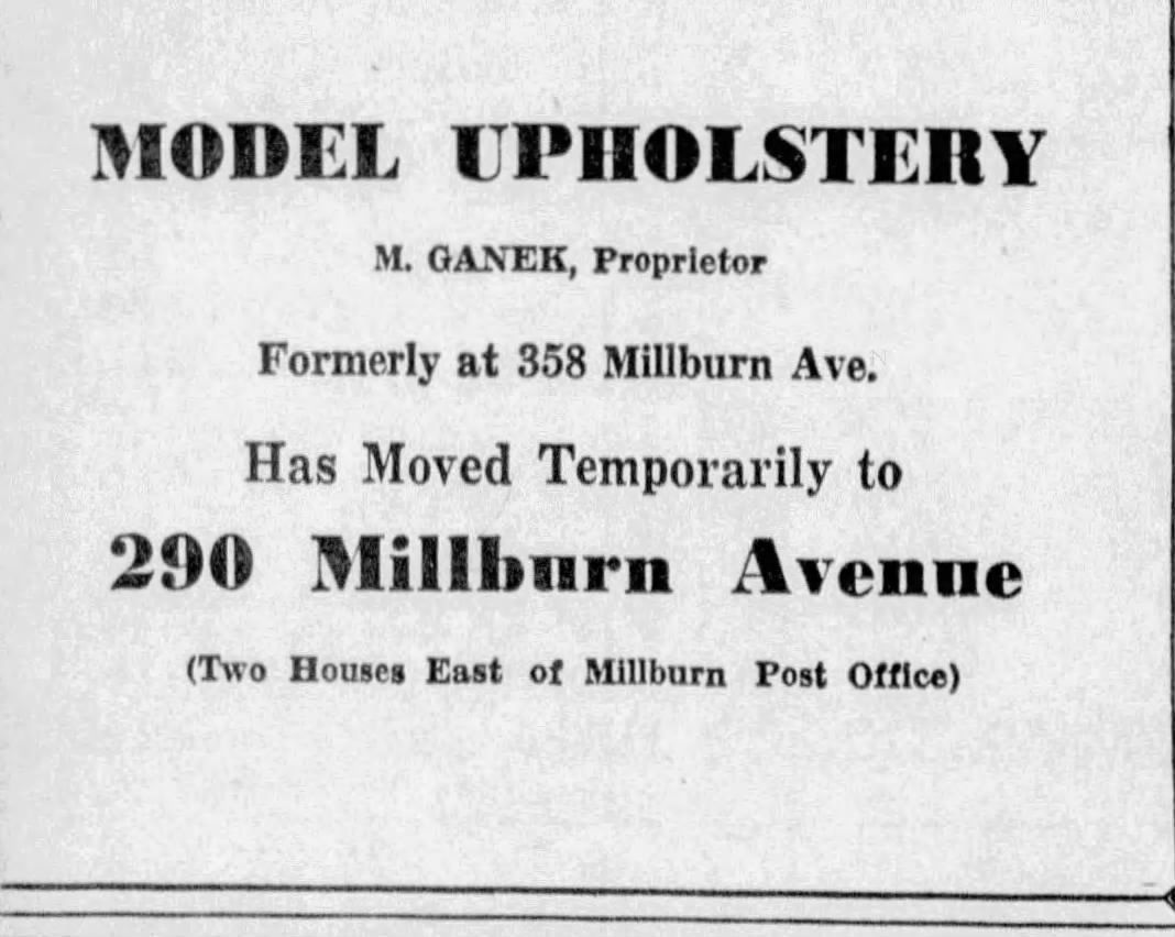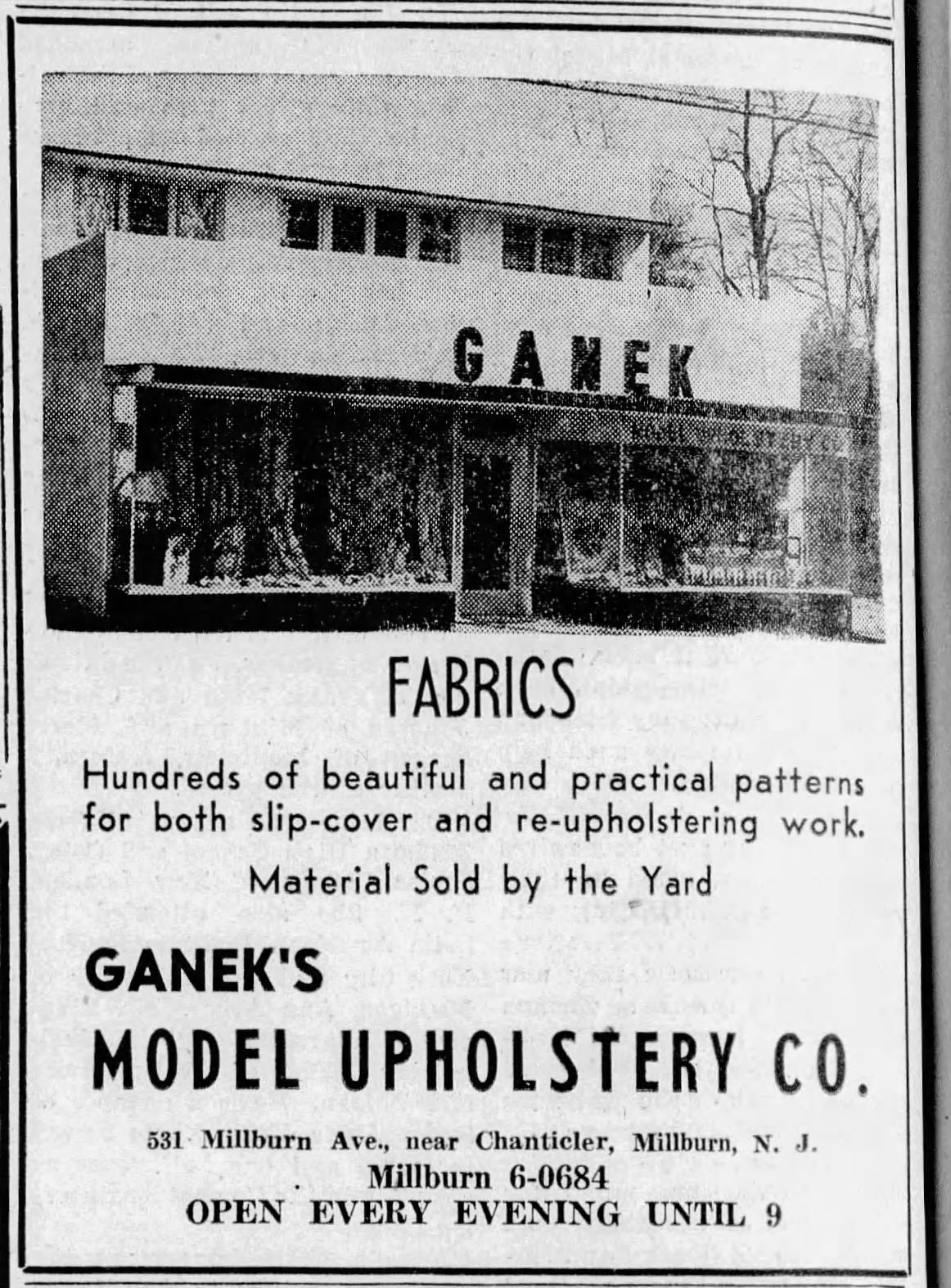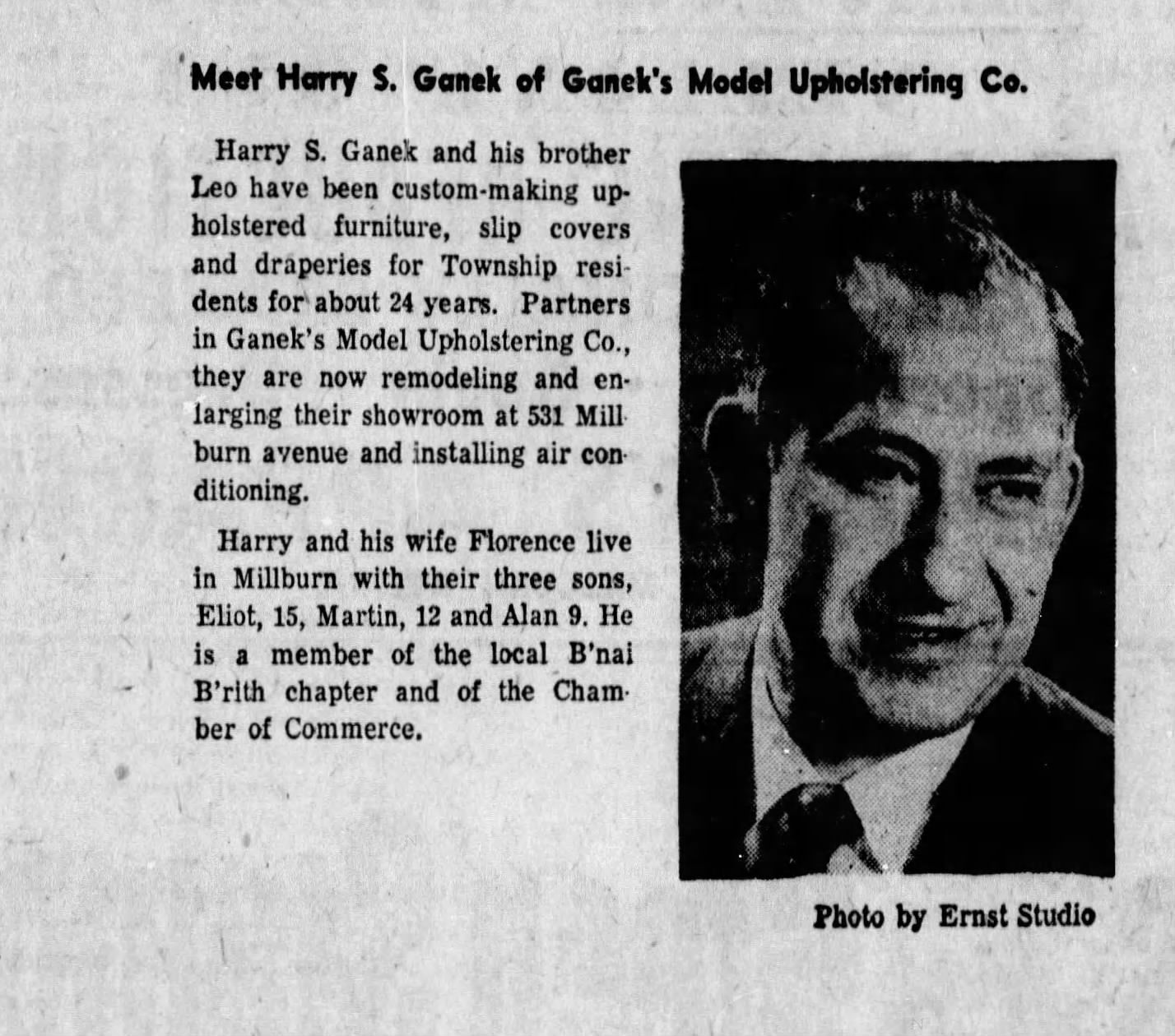 12 Photographs and negatives from the Ganek estate.Leo and Ida Ganek opened an upholstery business in the Downtown Millburn business district in 1936. They had two children: A daughter, Marcia, and an son, Edwin. The business then moved to the Whittingham Mansion, and again to 358 Millburn Avenue. Leo's brother Harry worked at the store and moved his family to the South Mountain neighborhood (28 South Mountain Road) in 1950. Harry and L. Florence Ganek had 3 sons: Martin, Elliot and Allan (MHS 1966).