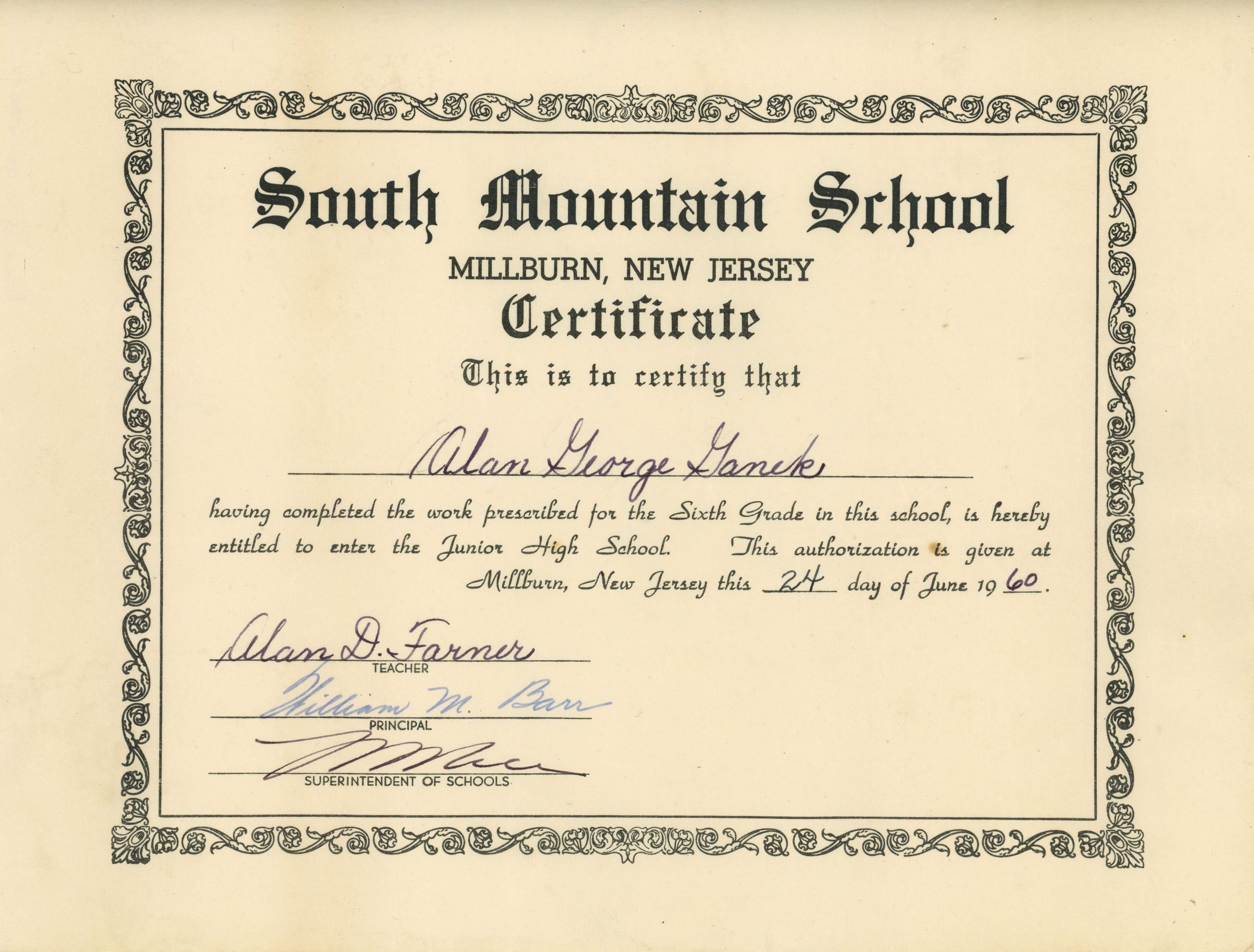 Certificate issued to Alan George Ganek authorizing his completion of 6th grade at South Mountain School and entitling him to enter Junior High School, issued on June 24, 1960. Signed by Alan D. Farner (Teacher), William M. Barr (Principal) and the Superintendent of Schools.Acquisition