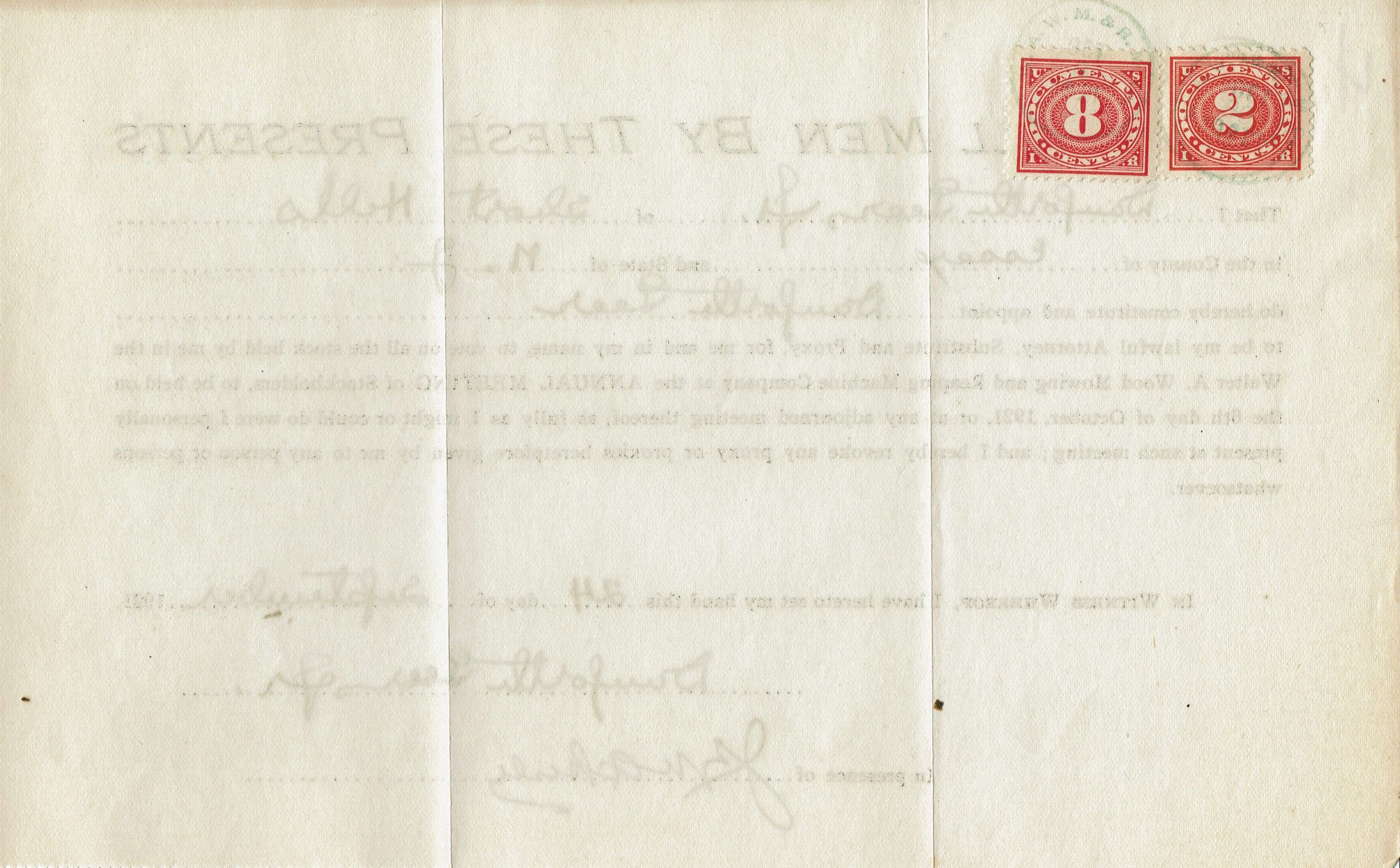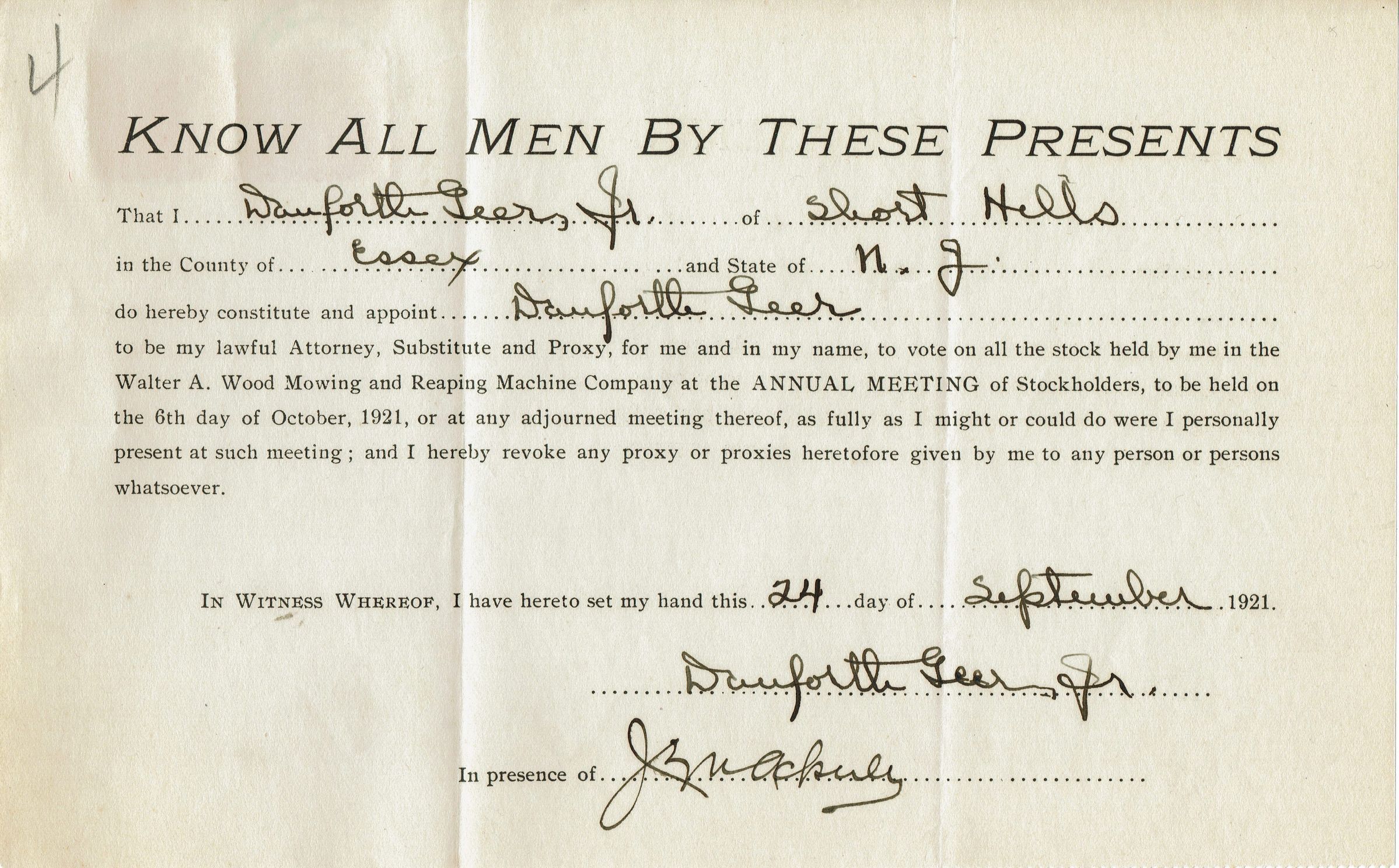 Certificate signed by Danforth Geer, Jr. of Short Hills appointing Danforth Geer to be his lawful Attorney, Substitute and Proxy to vote on all stock held in the Walter A. Wood Mowing and Reaping Machine Company at the annual stockholders meeting on October 6, 1921.Acquisition