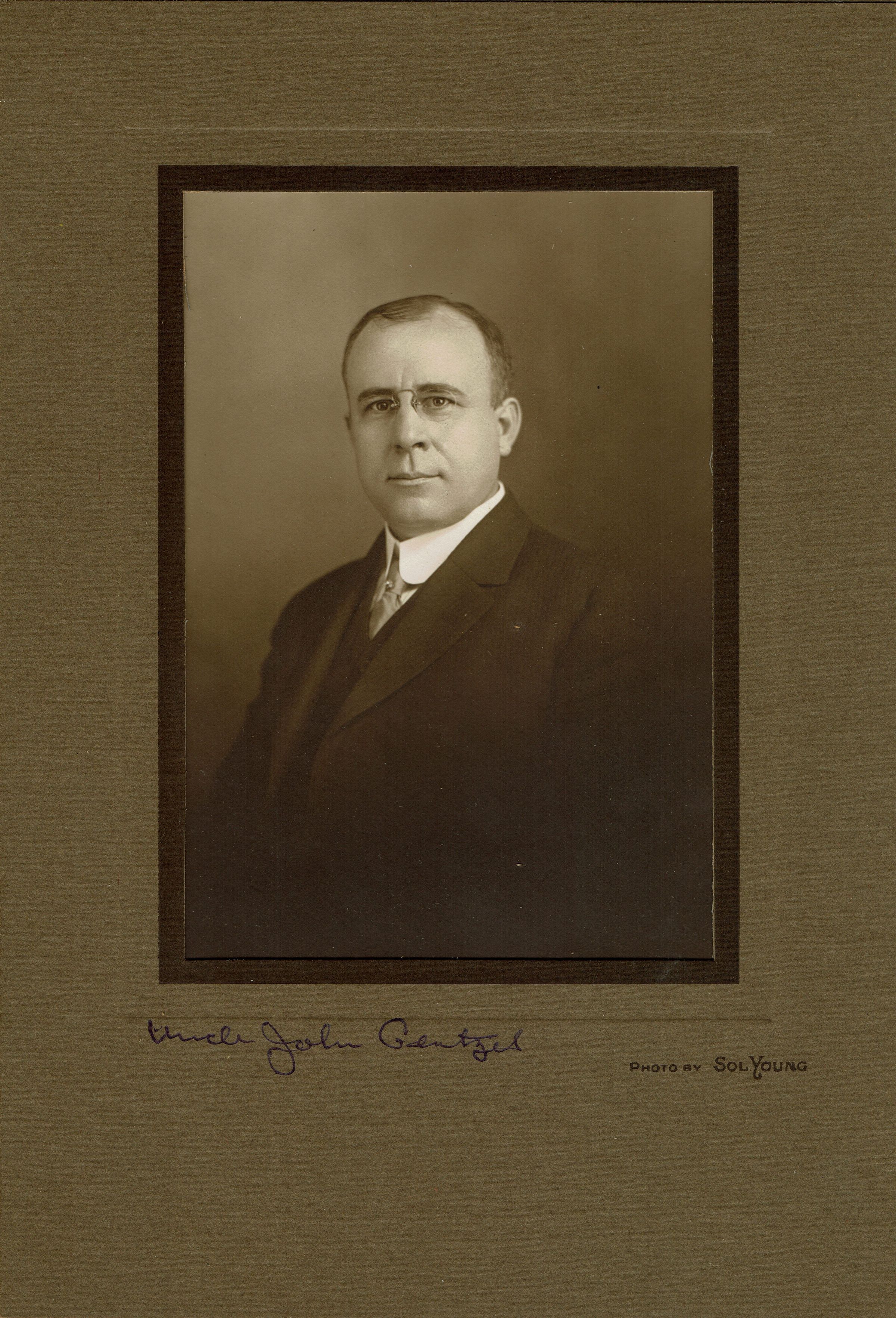 Photograph of John Gentzel, taken by Sol Young. Mounted in brown cardboard folder.
