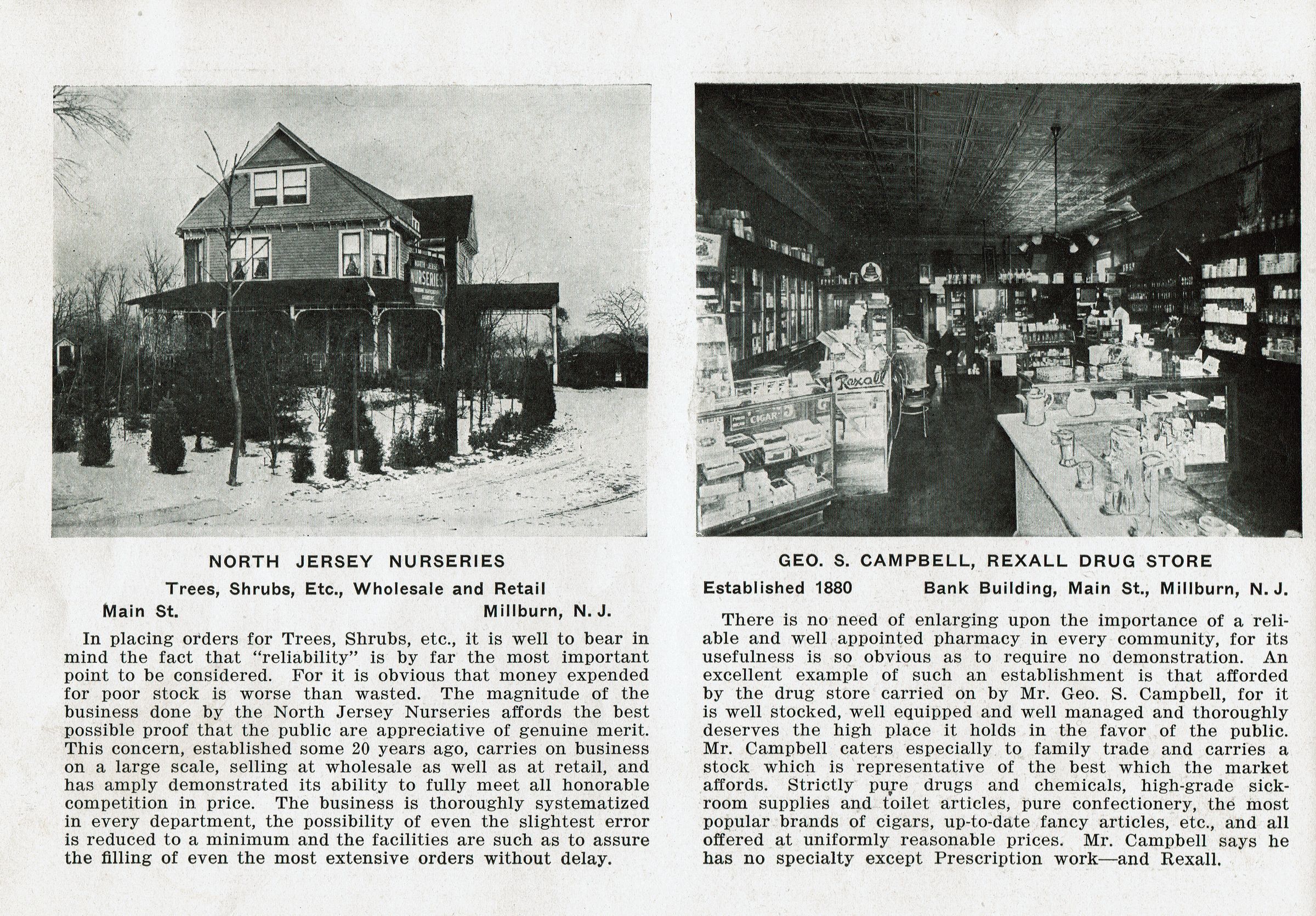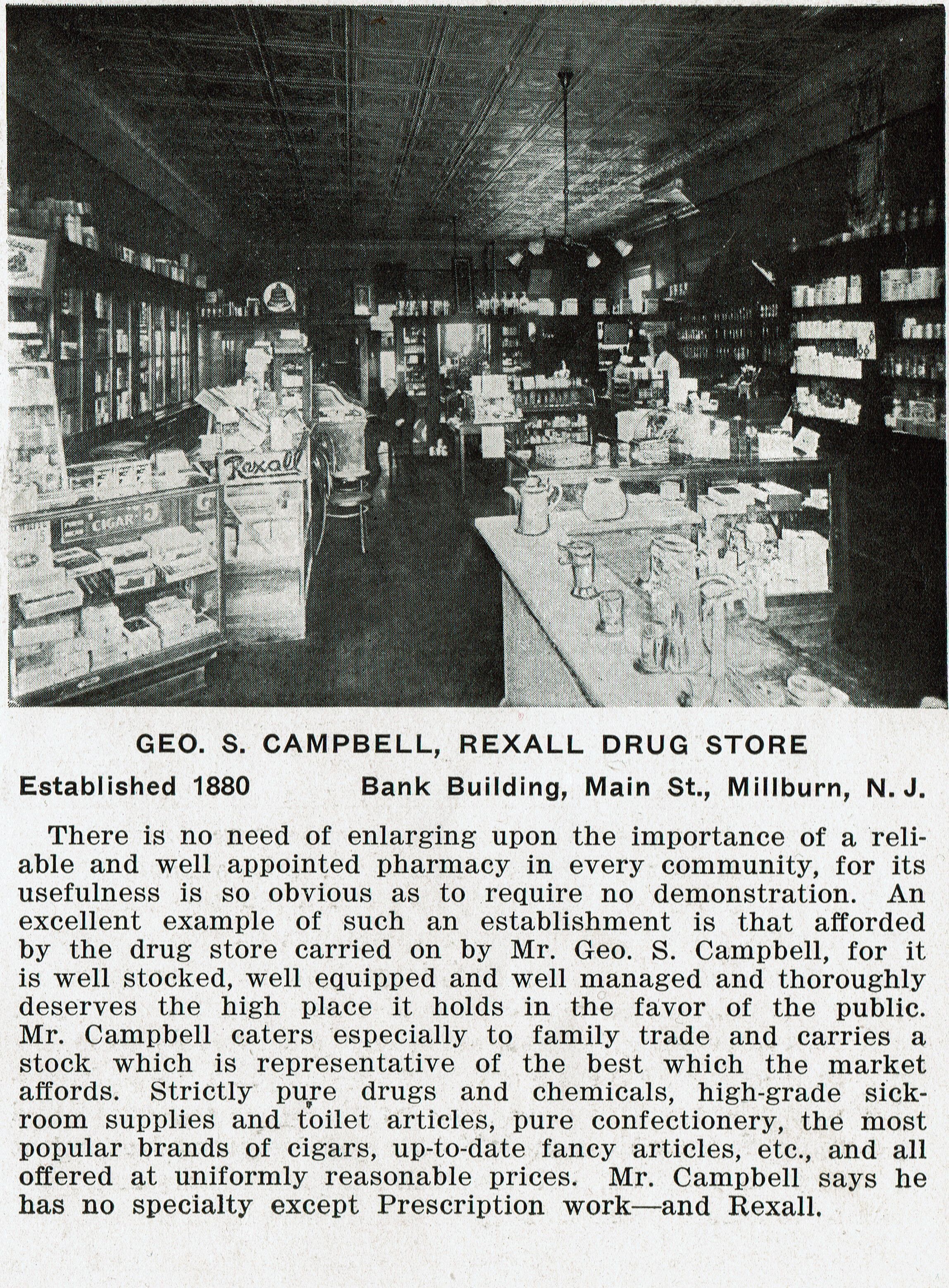 Photograph of the interior of George S. Campbell's Drug Store in the Bank Building on Main Street in Millburn from "South Orange, Maplewood, Millburn & Springfield, N.J." New York: G.W. Richardson (undated), belonging to William Mangold (60 Whittingham Terrace, Millburn). See: 2022.236.020.