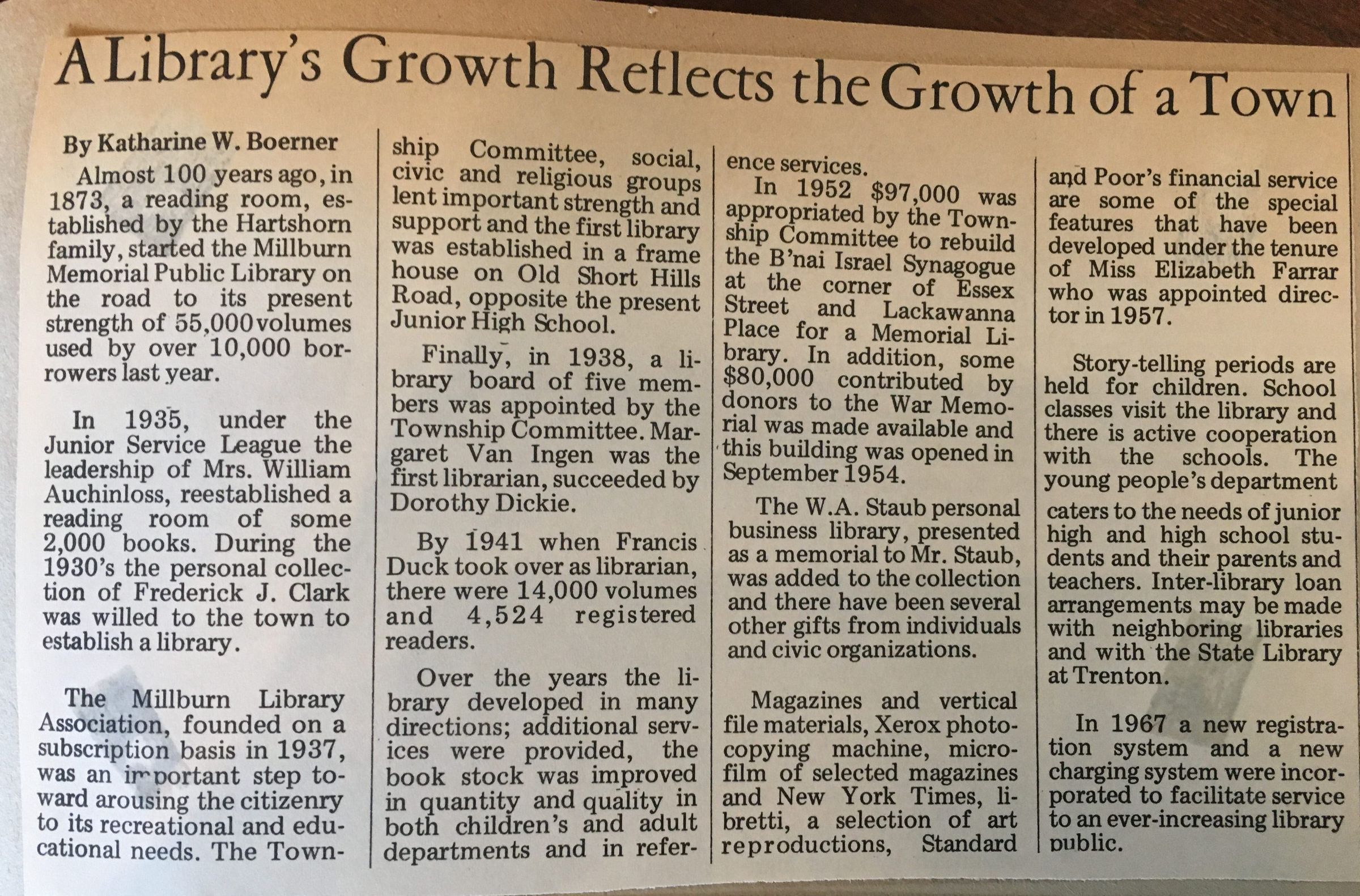 Newspaper clipping of "A Library's Growth Reflects the Growth of a Town" - written by Katharine W. Boerner.Dimensions
