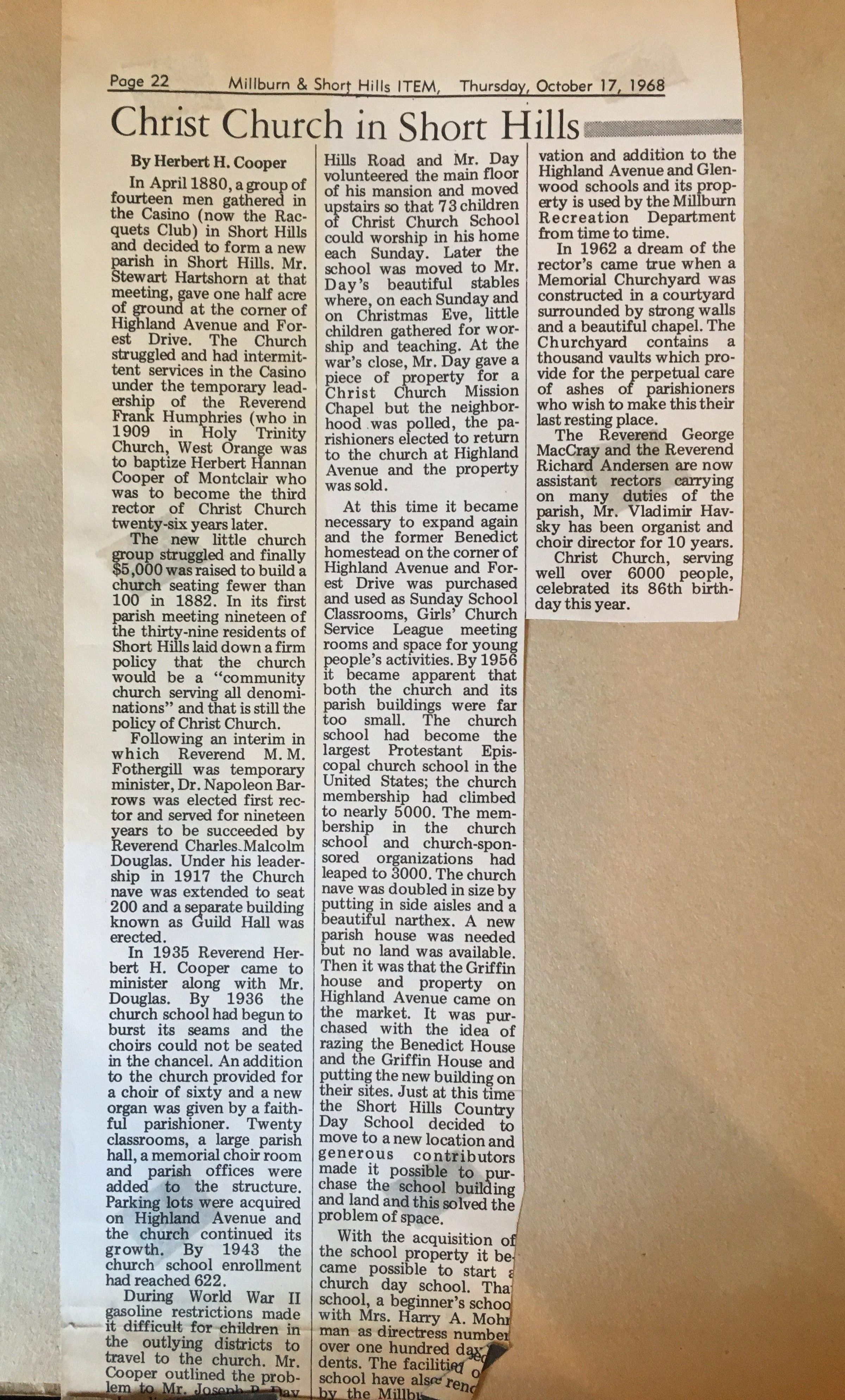 Newspaper clipping of "Christ Church in Short Hills" article in the Millburn & Short Hills ITEM. Written on October 17, 1968 by Herbert H. Cooper.