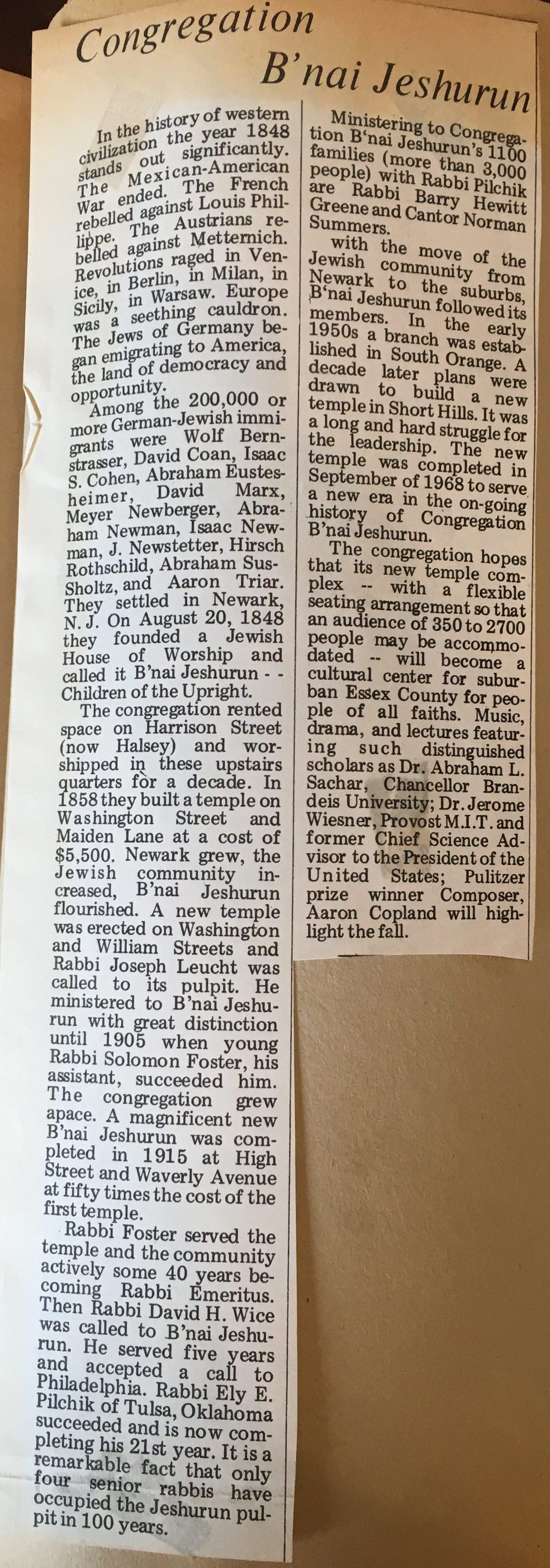 Newspaper clipping on the history of Congregation B'nai Jeshurun.