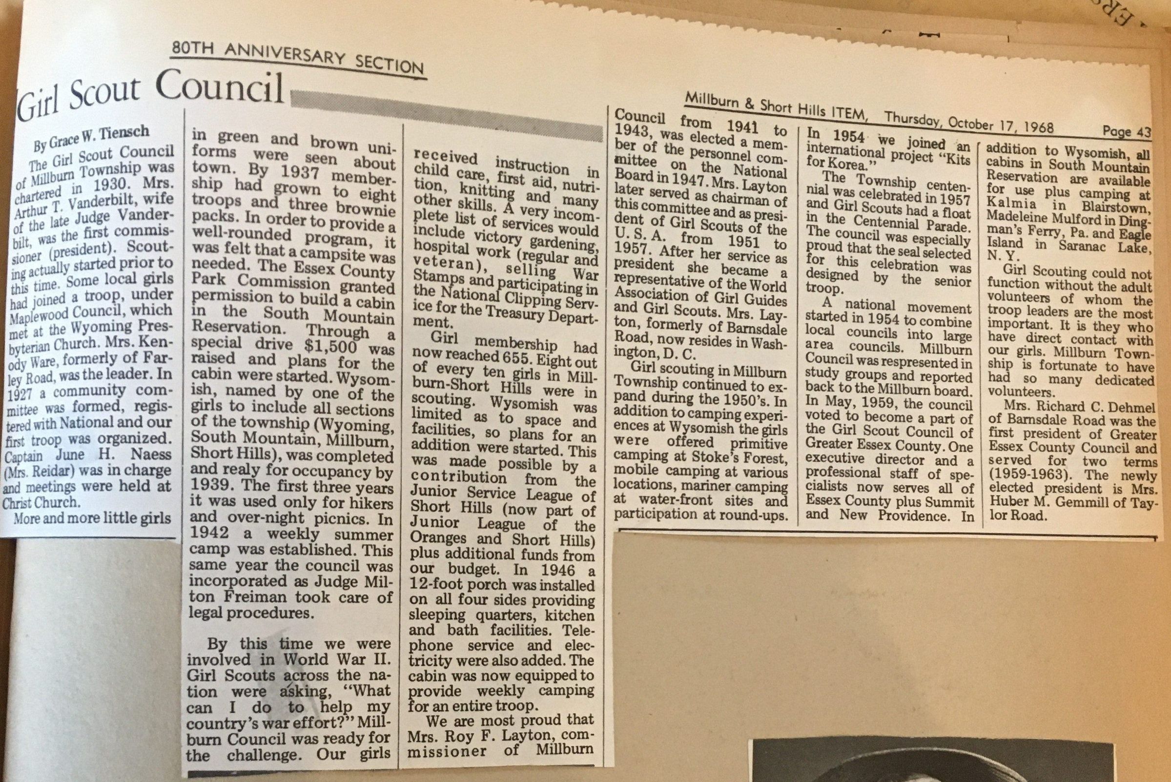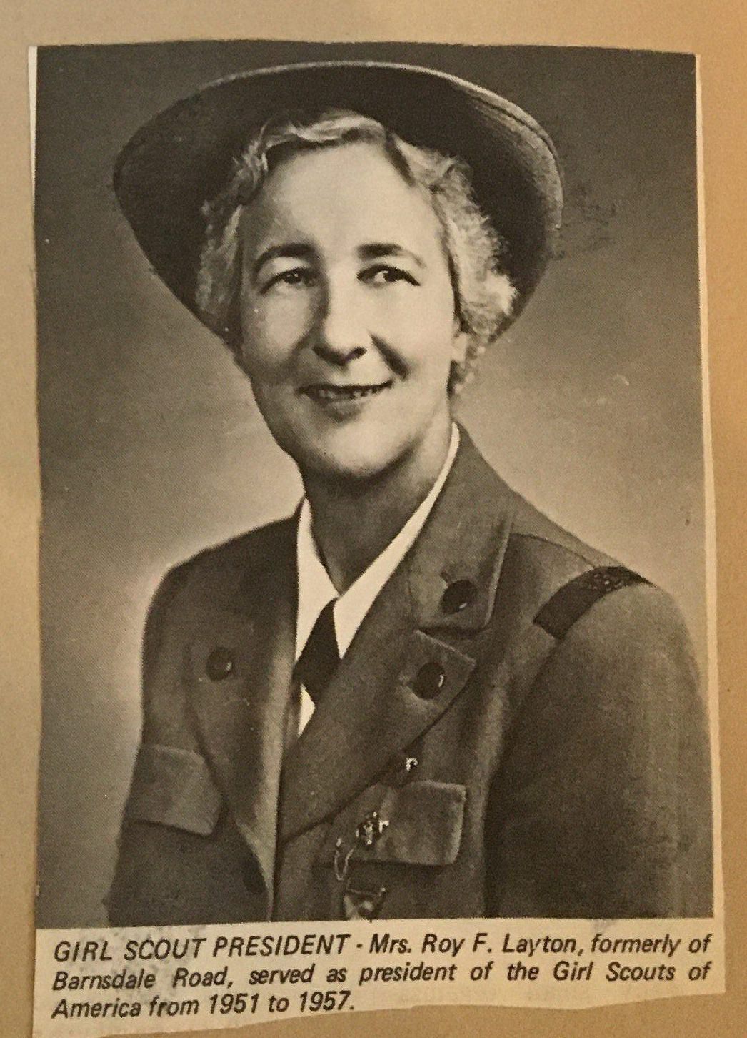 Newspaper clipping of "Girl Scout Council" article. Picture of Girl Scout President Mrs. Roy F. Layton below.