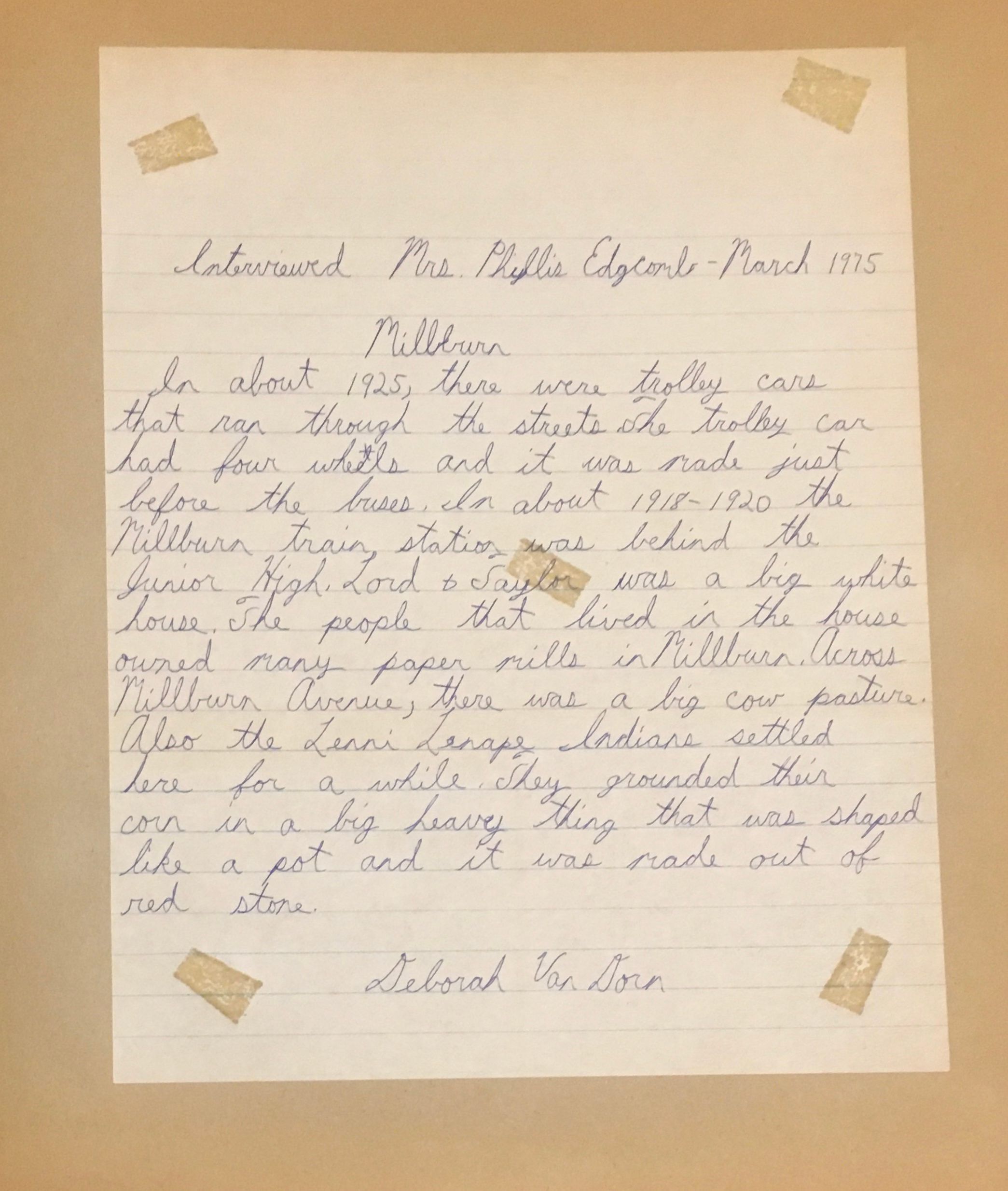 Interview with Mrs. Phyllis Edgcomb by Deborah Van Dorn about Millburn in the past.