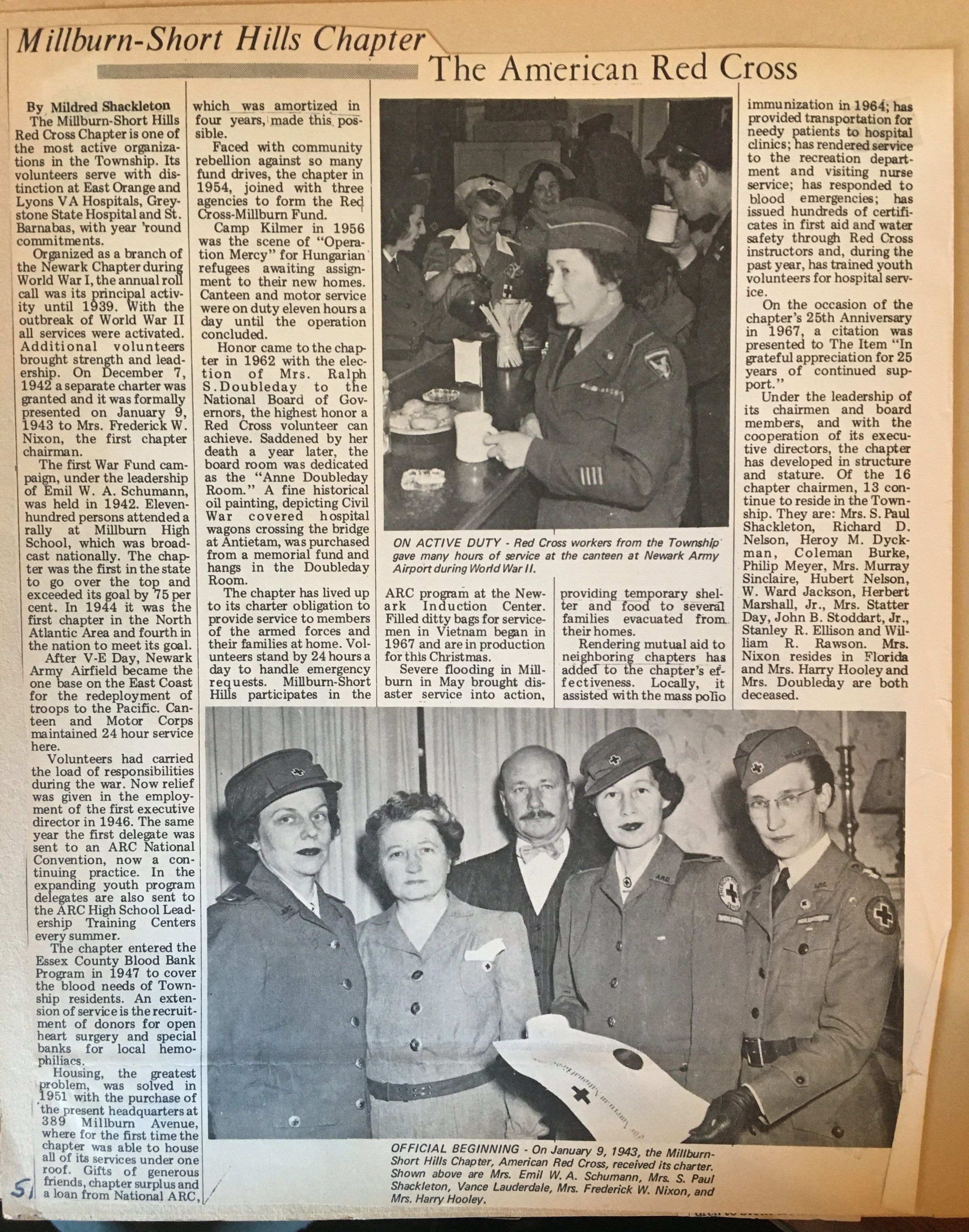 Newspaper clipping of "The American Red Cross" article from the Millburn-Short Hills Chapter. Written by Mildred Shackleton.