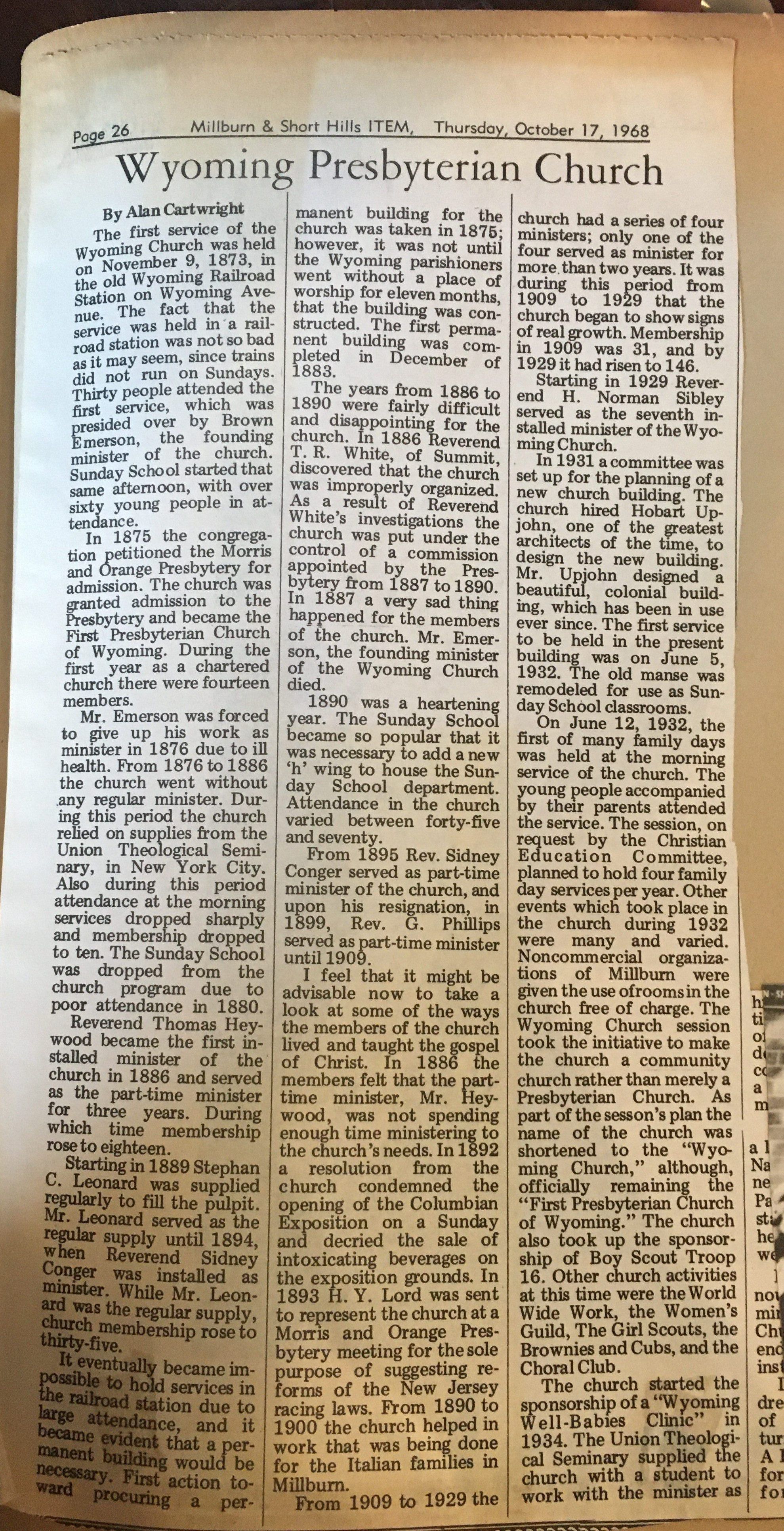 Newspaper clipping of the "Wyoming Presbyterian Church" article from the Millburn & Short Hills ITEM. Written on October 17, 1968 by Alan Cartwright.Dimensions