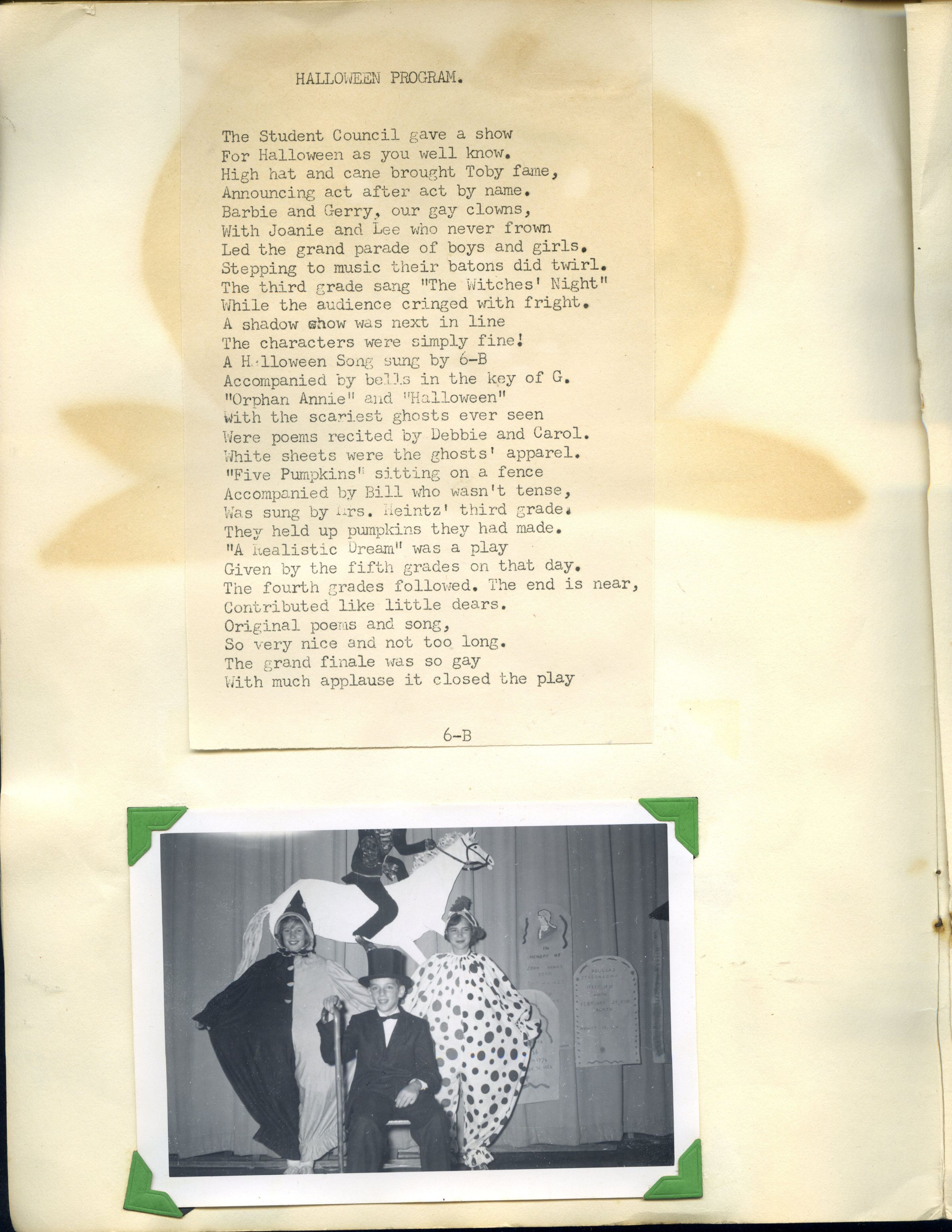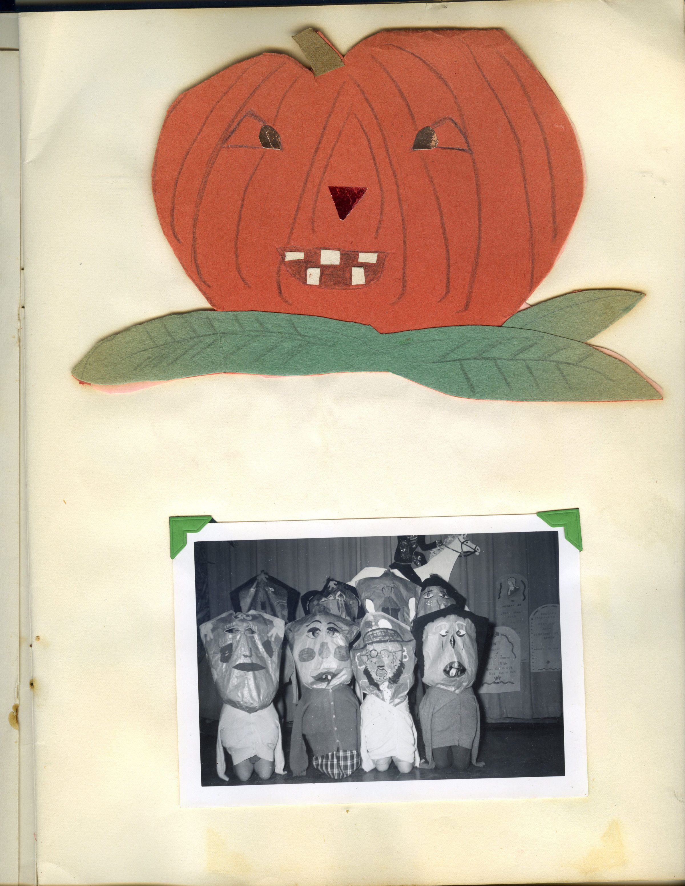Scrapbook with various entries and images, including class president campaign buttons and class activities (Halloween, winter program, radio play, 6th grade trip to B'nai Israel, paper making, Red Cross, etc). An envelope in the back includes 14 items.Acquisition