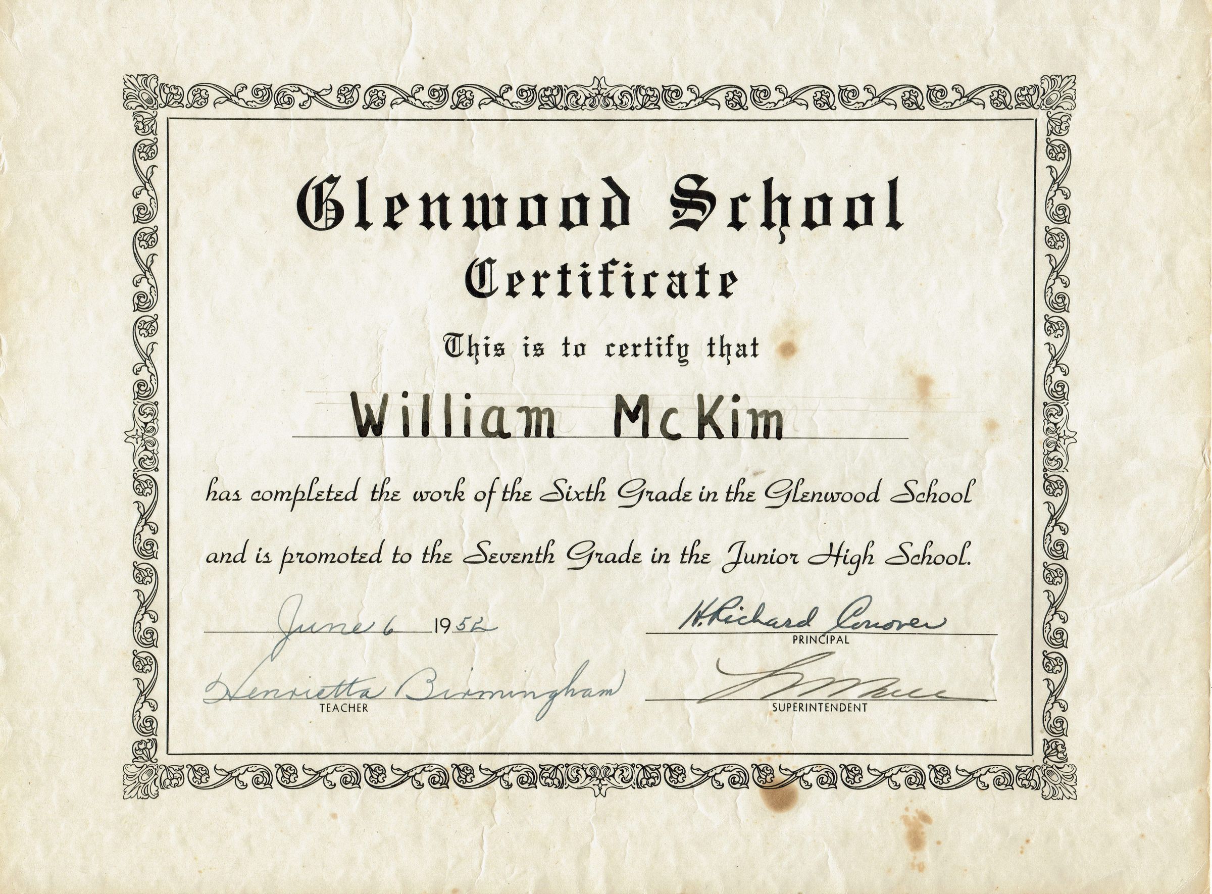Glenwood School Certificate issued to William McKim stating that William McKim "completed with work of the sixth grade in the Glenwood School and is promoted to the seventh grade in the Junior High School" and dated June 6, 1952.Acquisition