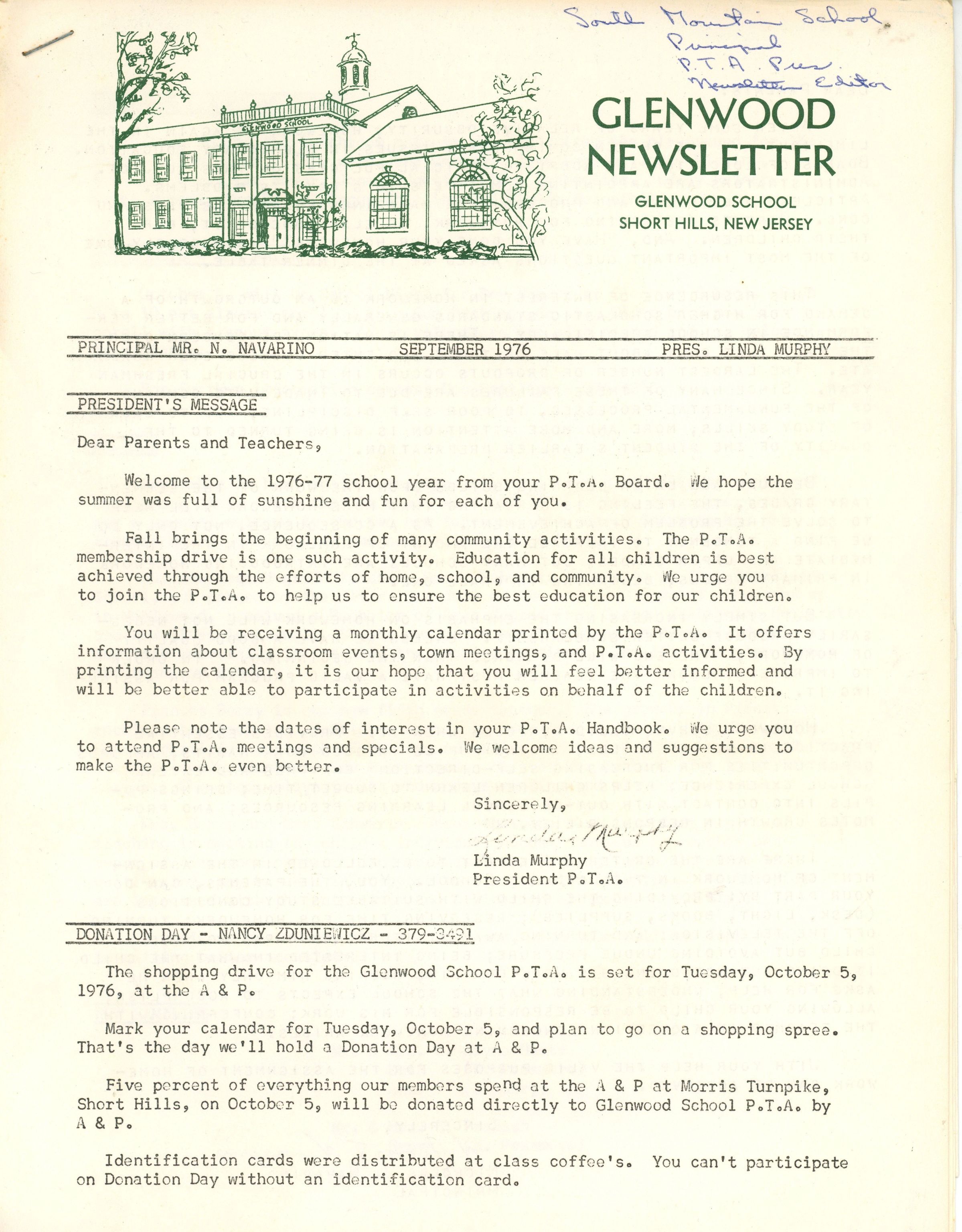 Glenwood PTA Newsletters(4): September 1976, January 1977, May 1977, September 1977. Typewritten and stapled newsletters covering school news and PTA sponsored activities. Contains message from Nicholas J. Navarion, Principal of Glenwood School. Linda Murphy (PTA President 1976-1977 academic year) and Nancy Zduniewicz (PTA President 1977-1978 academic year).Acquisition