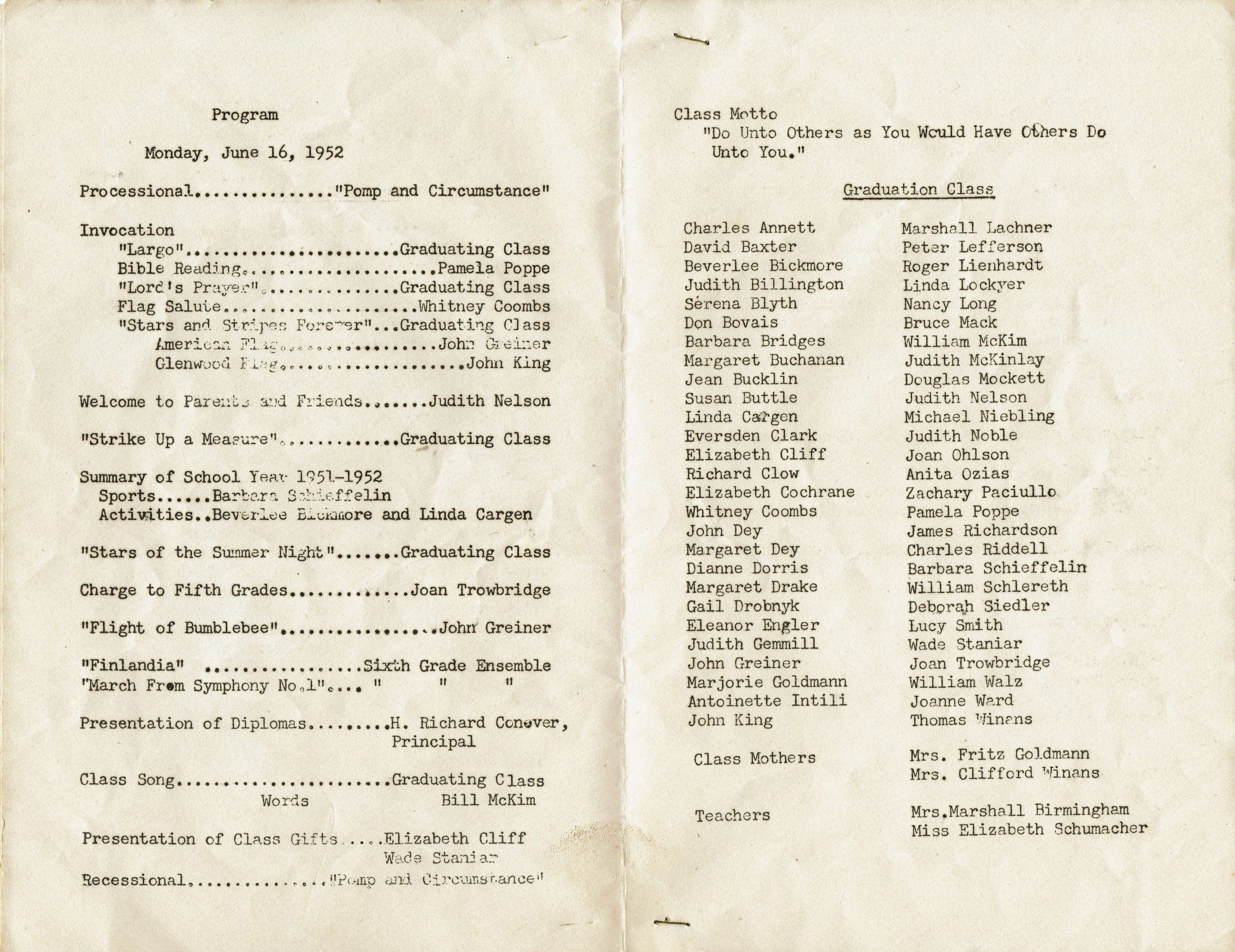 Sixth Grade Graduation Program from Glenwood School June 16, 1952. 4 pp., stapled pamphlet.