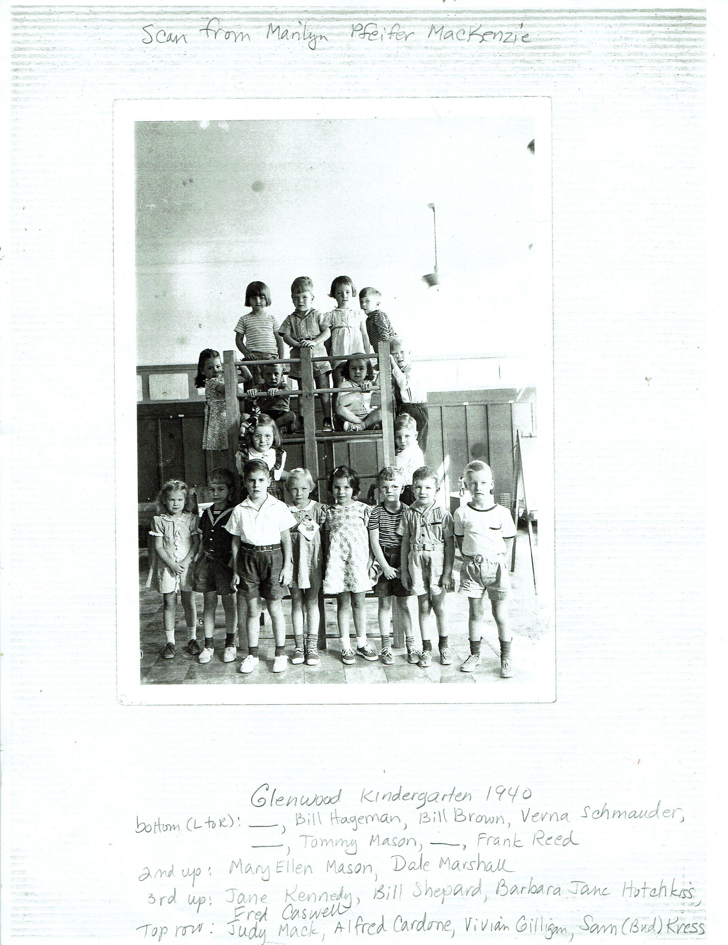 Scan of a photograph from Marily Pfeifer MacKenzie of Glenwood School's 1940 Kindergarten class with names partially identified.Acquisition
