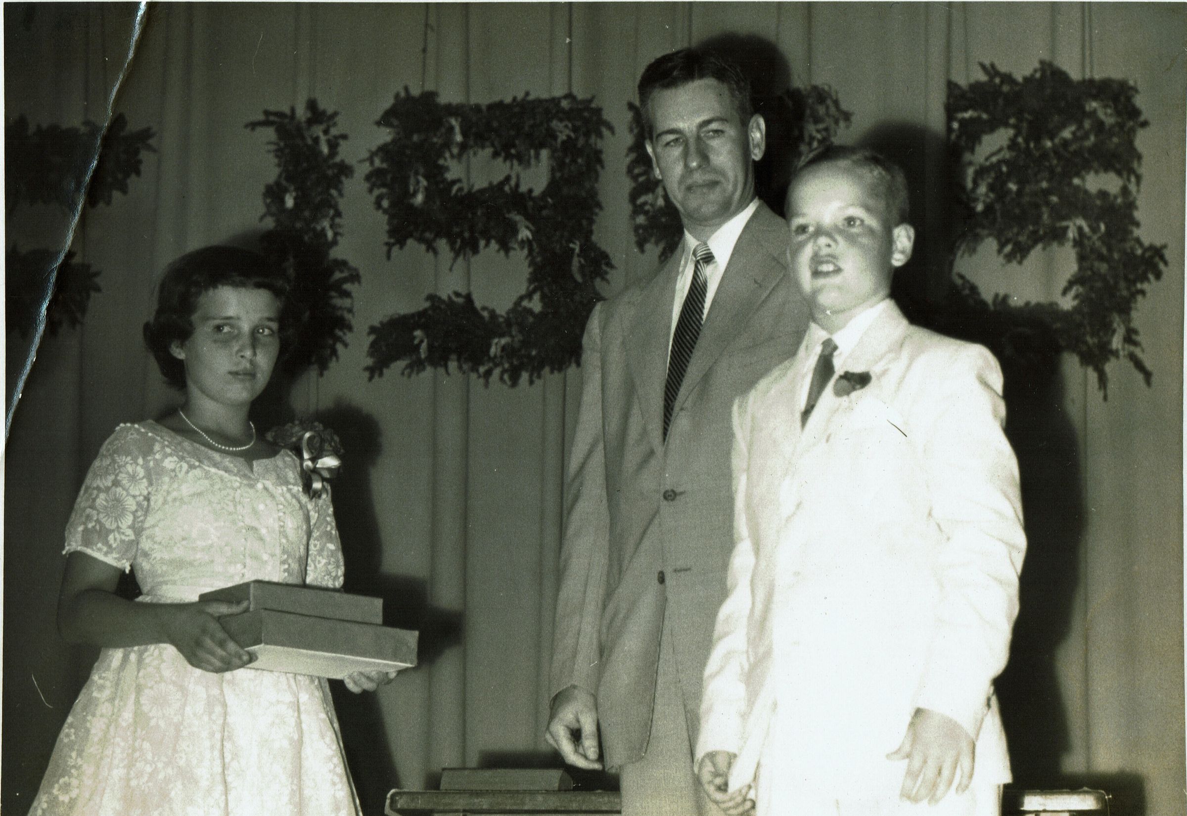 Photograph of Glenwood Elementary School Principal Richard Conover at a school event with two students in 1953. Students have not been identified, nor has the event.Acquisition