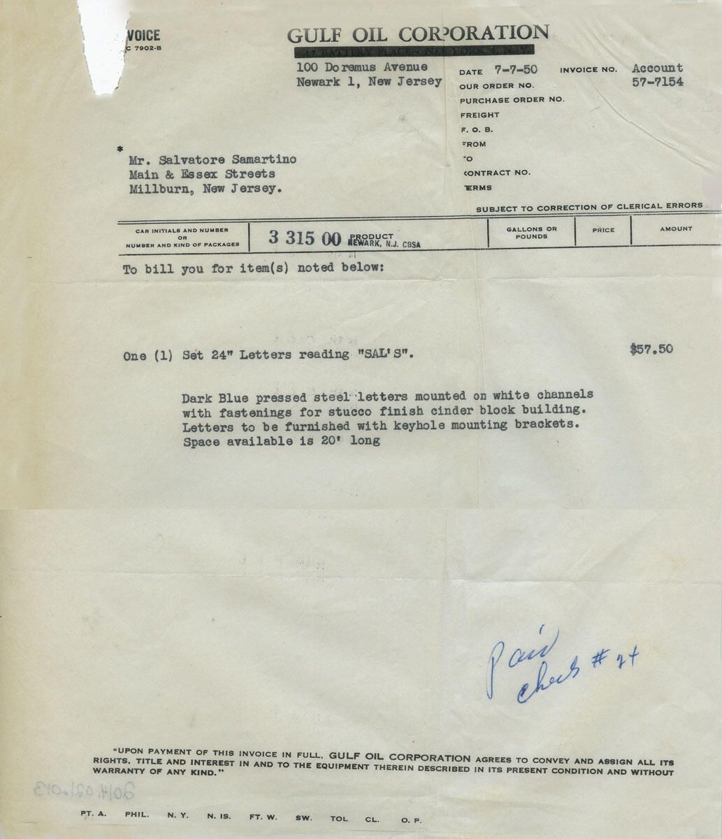 A1950 invoice from Gulf Oil Corporation to Salvatore Sammartino, owner/operator of Sal's Gulf Service Station at the corner of Main and Essex Streets. Salvatore Sammartino was related to the two Sammartino sisters from whose home on Orchard Street the letter came. The invoice is for "One set 24" letters reading 'Sal's'. Dark blue pressed steel letters mounted on white channels with fastenings for stucco finish cinder block building. Letters to be furnished with keyhole mounting brackets. Space available is 20' long." The invoice has a 1" deep tear at the upper right corner, 3/4" from the left edge of the letter.Acquisition