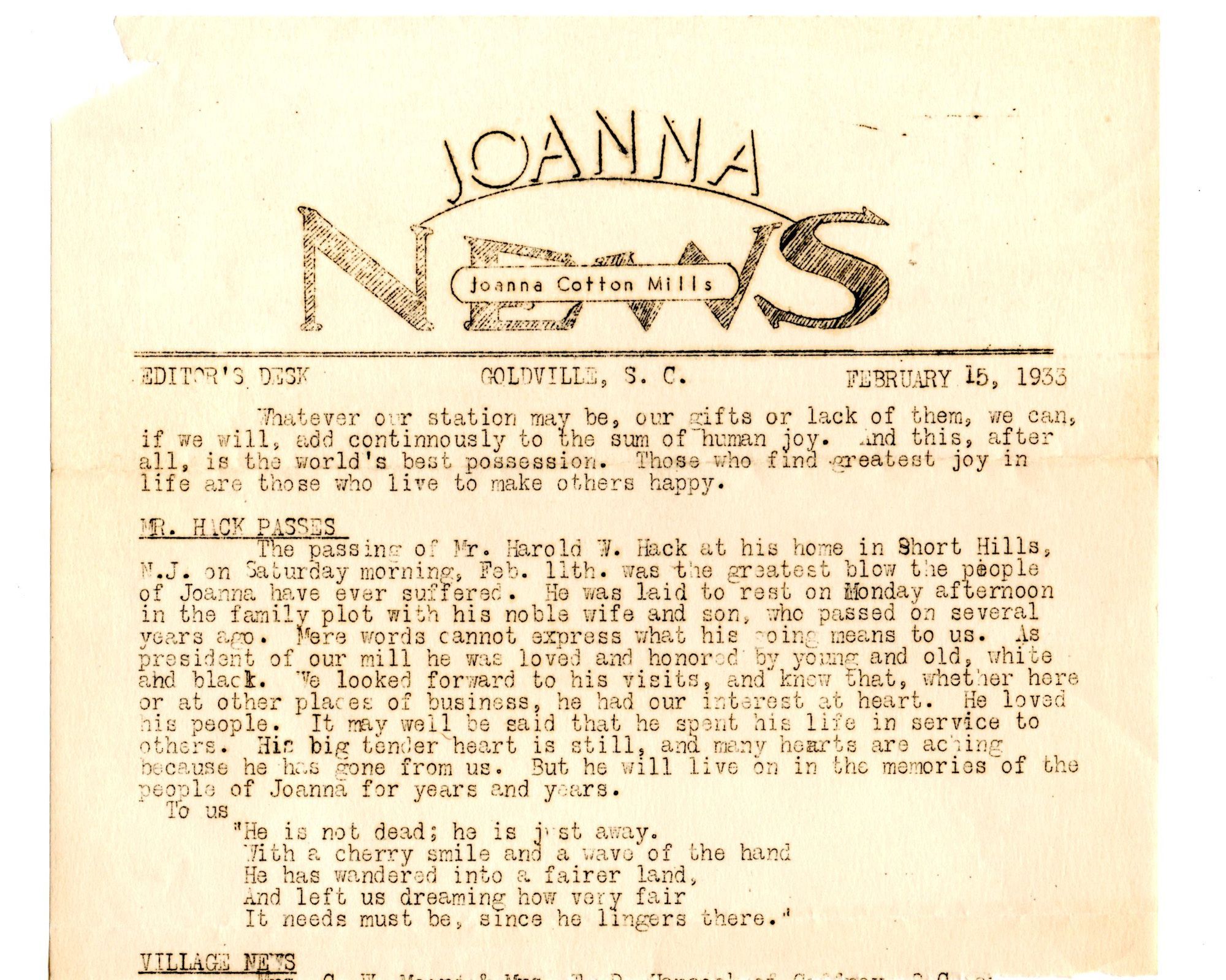 Hack: Harold Hack Obituary, Joanna Cotton Mills News, February 15, 1933Entry/Object ID