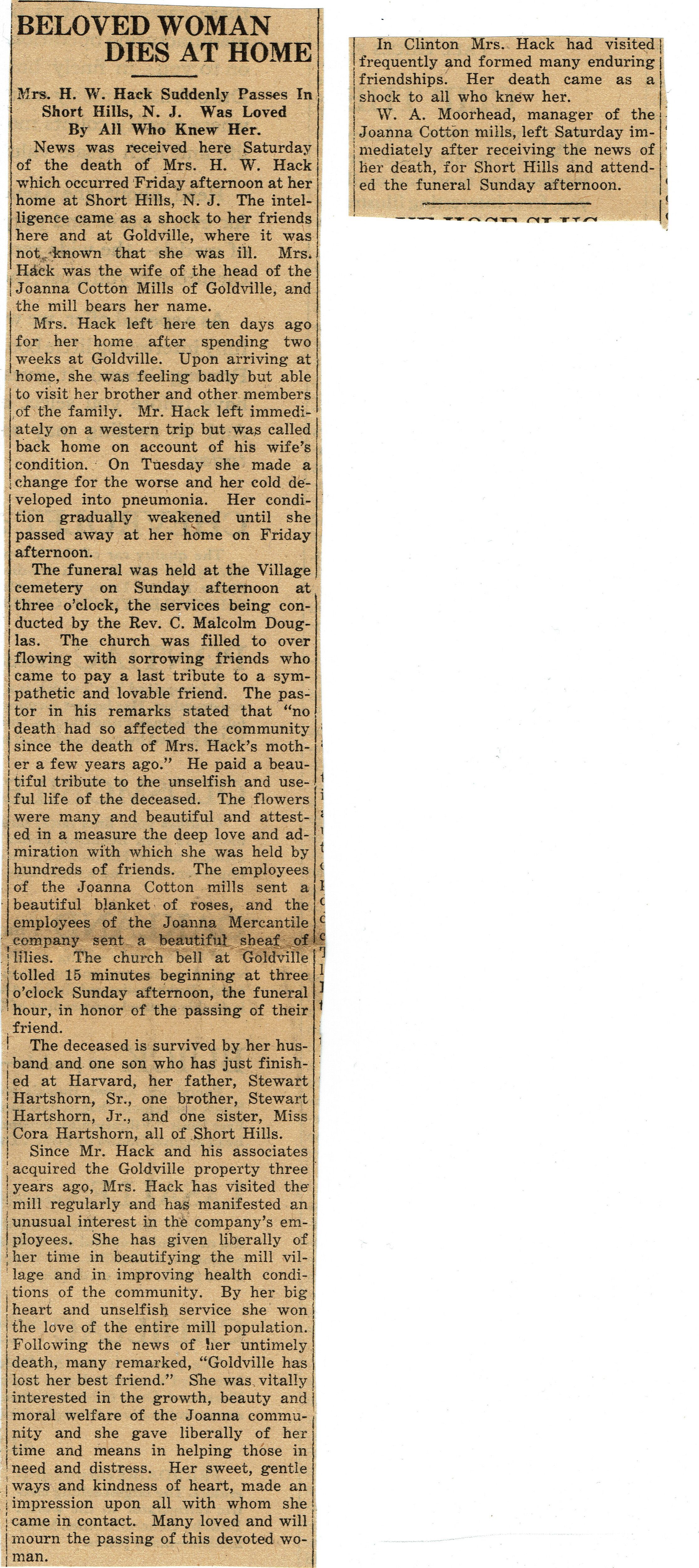 News was received here Saturday of the death of Mrs. H. W. Hack which occurred Friday afternoon at her home at Short Hills, N. J. The intelligence came as a shock to her friends here and at Goldville, where it was not known that she was ill. Mrs. Hack was the wife of the head of the Joanna Cotton Mills of Goldville, and the mill bears her name.