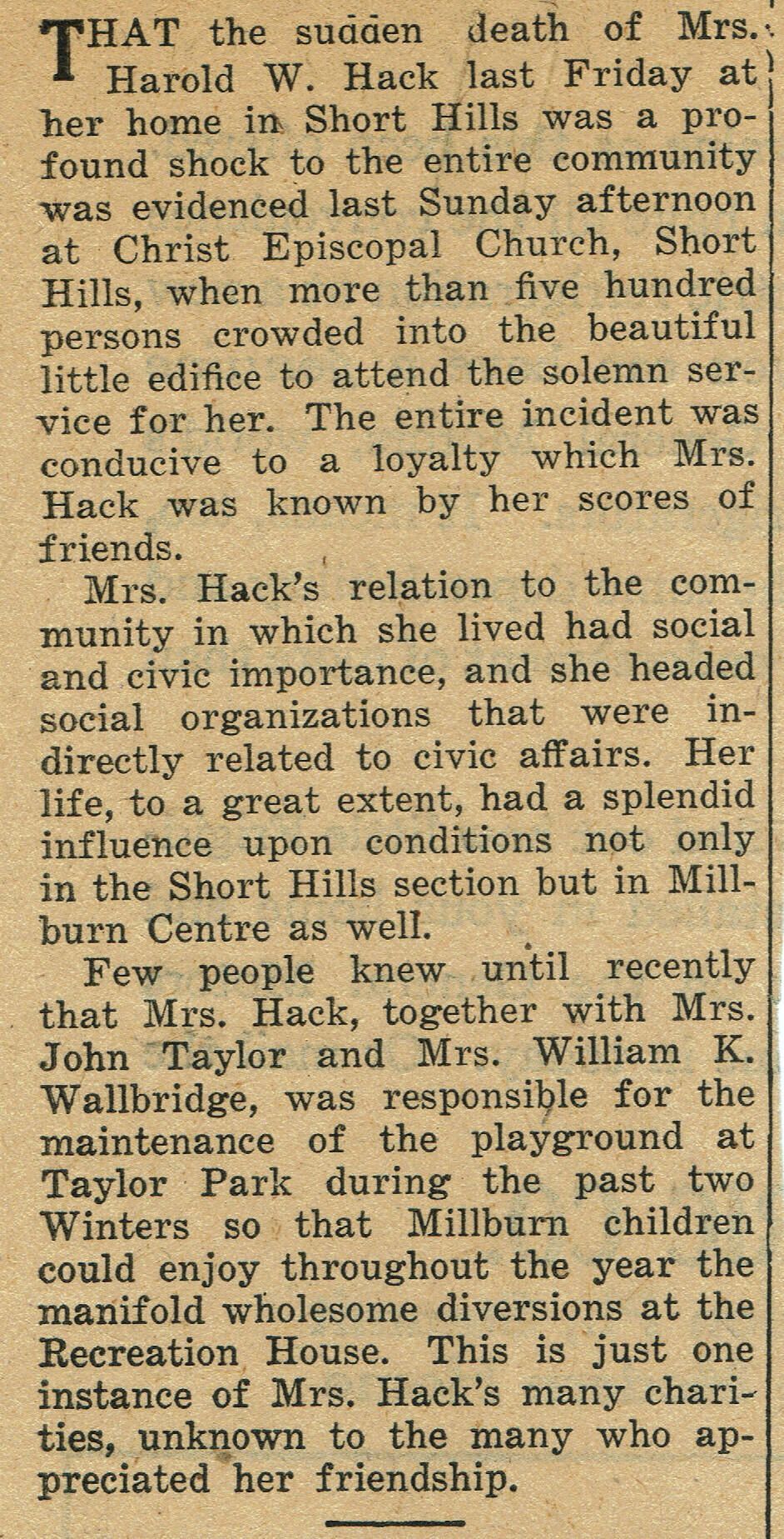 Death notice and tribute to Mrs. Harold W. Hack, April 1927. Probably from the Millburn-Short Hills Item. Notice discusses her civic importance, her involvement with Mrs. John Taylor and Mrs. William K. Wallbridge in maintaining the Taylor Park Playground1926-7.Collection