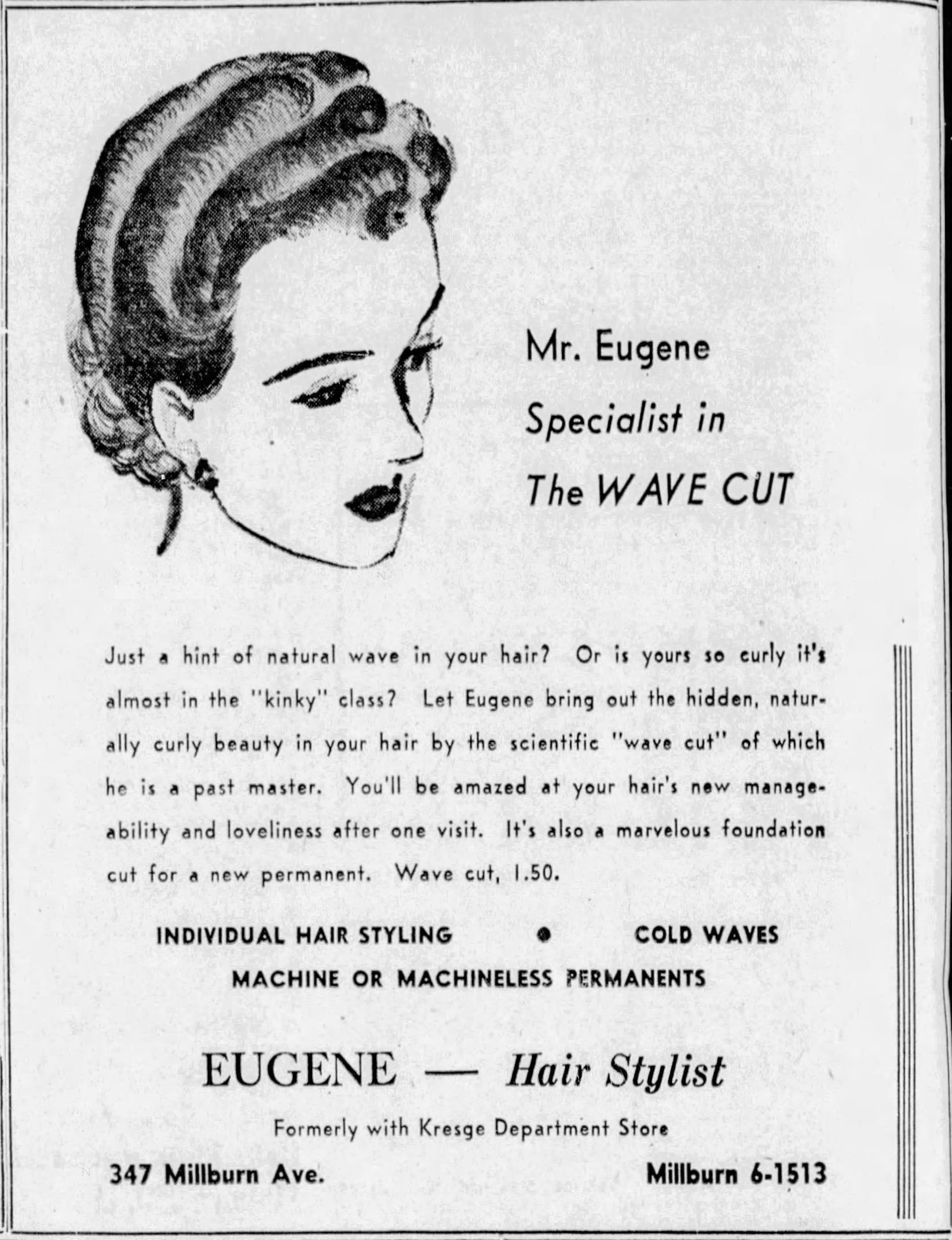 Eugene Hair Stylist opened at 347 Millburn Avenue in 1944 and remained in town until 1966, when it moved to a larger location in Maplewood, NJ. The case dates from c. 1944-1958, before the phone extension changed from MI. to DR.Acquisition