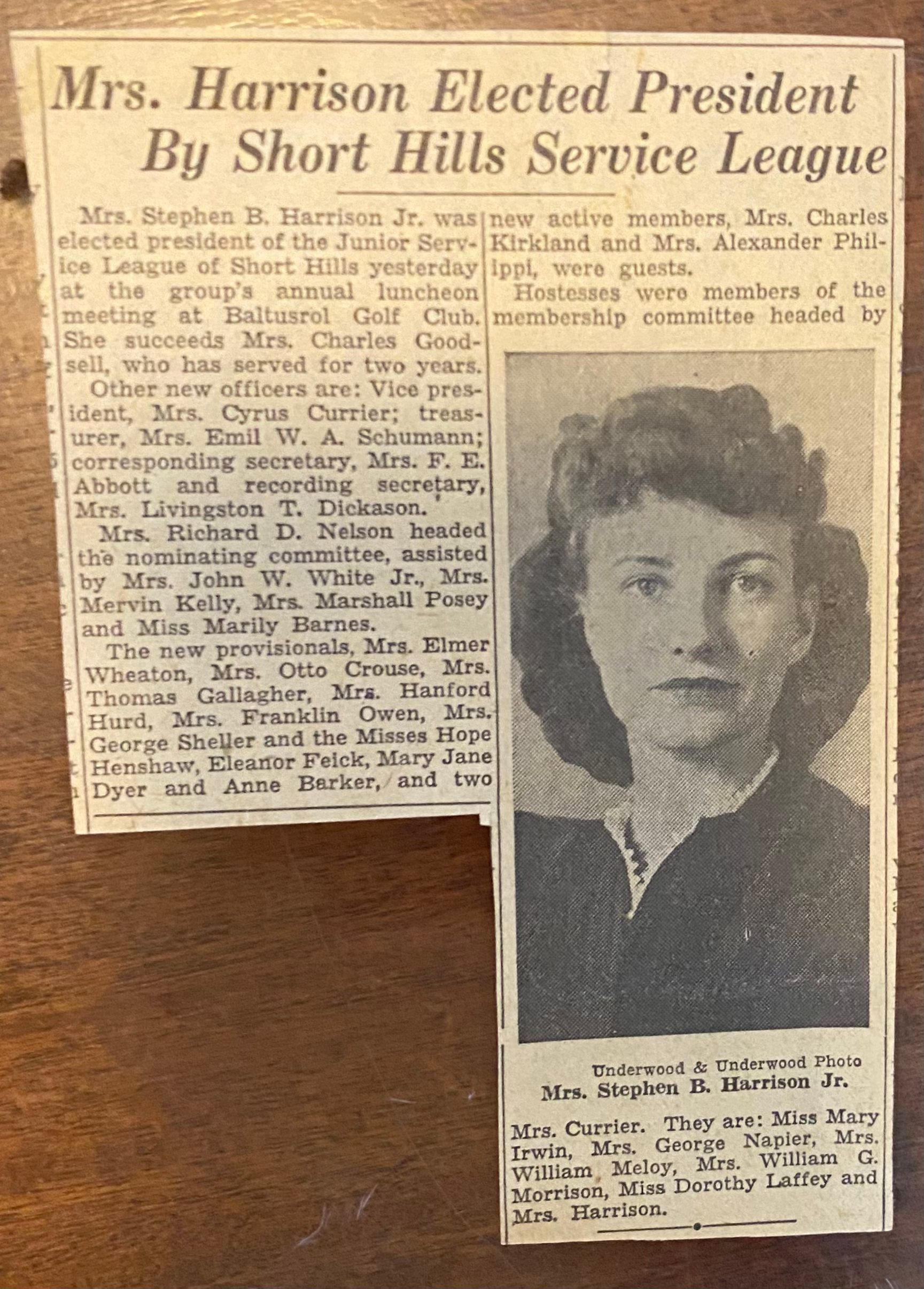 A newspaper clipping titled "Mrs. Harrison Elected President by Short Hills Service League." Mrs. Stephen B. Harrison Jr. is pictured. The Baltusrol Golf Club is mentioned. Other names mentioned include Mrs. Charles Goodsell, Mrs. Cyrus Currier, Mrs. Emil W. A. Schumann, Mrs. F. E. Abbott, Mrs. Livingston T. Dickason, Mrs. Richard D. Nelson, Mrs. John W. White Jr., Mrs. Mervin Kelly, Mrs. Marshall Posey, Miss Marily Barnes, Mrs. Elmer Wheaton, Mrs. Otto Crouse, Mrs. Thomas Gallagher, Mrs. Hanford Hurd, Mrs. Franklin Owen, Mrs. George Sheller, Miss Hope Henshaw, Miss Eleanor Feick, Miss Mary Jane Dyer, Miss Anne Barker, Mrs. Charles Kirkland, Mrs. Alexander Philippi, Miss Mary Irwin, Mrs. George Napier, Mrs. William Meloy, Mrs. William G. Morrison, and Miss Dorothy Laffey.Acquisition