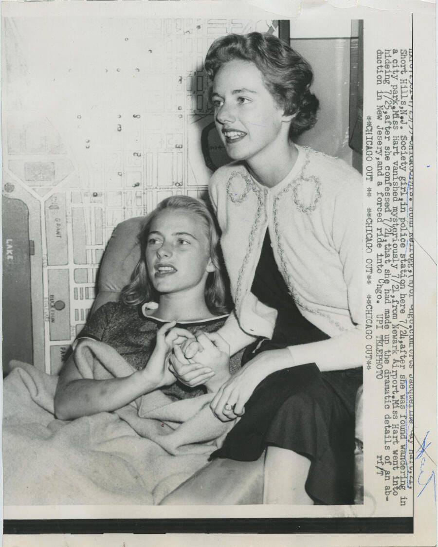 B/W glossy press photo of Jacqueline Gay Hart of Short Hills and Mrs. John Kellogg of Chicago in the Chicago police station. Text accompanying the reprinted photo notes: "????? 7/25(?)/59 - Chicago: Mrs. John Kellogg (????) Chgo. comforts Jacqueline Gay Hart, 21, Short Hills, N.J. Society girl, in police station here 7/24, after she was found wandering in a city park. Miss Hart vanished mysteriously 7/21, from Newark Airport. Miss Hart went into hideing (sic) 7/25, after she confessed 7/24, that she made up the dramatic details of an abduction in New Jesery (sic), and a forced ride into Chgo. UPI TELEPHOTO rf/t; **CHICAGO OUT** **CHICAGO OUT** **CHICAGO OUT**" On the back of the photo is a stamped: REFERENCE; Aug 5-'59; N.E.A., a penciled 'A91110', and a bar code strip. An inked "Hart" is written above the barely-visible name Hart on the photo. There is a 1/4" long tear 2 1/2" down from the top, on the left edge of the photo. Near the middle top of the photo is an impression of vertical and horizontal lines. Corners are bumped. Purchased on eBay from Historic Images; 6073 Mt. Moriah Ext; Memphis TN 35115, for $2.98.Acquisition