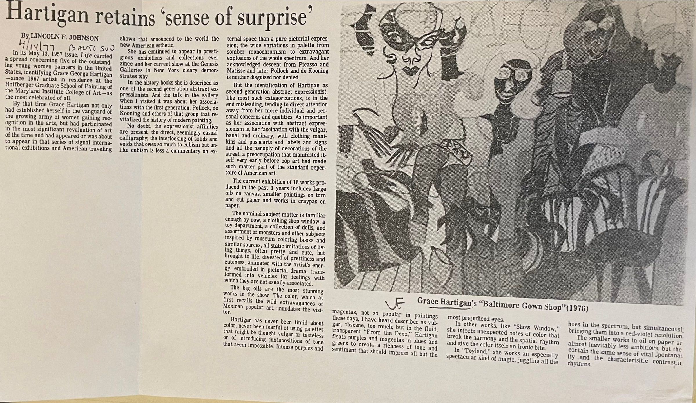 The Balto Sun article "Hartigan retains 'sense of surprise'" by Lincoln Johnson talks about Hartigan's accomplishments and discusses whether or not she is a second generation abstract expressionist.