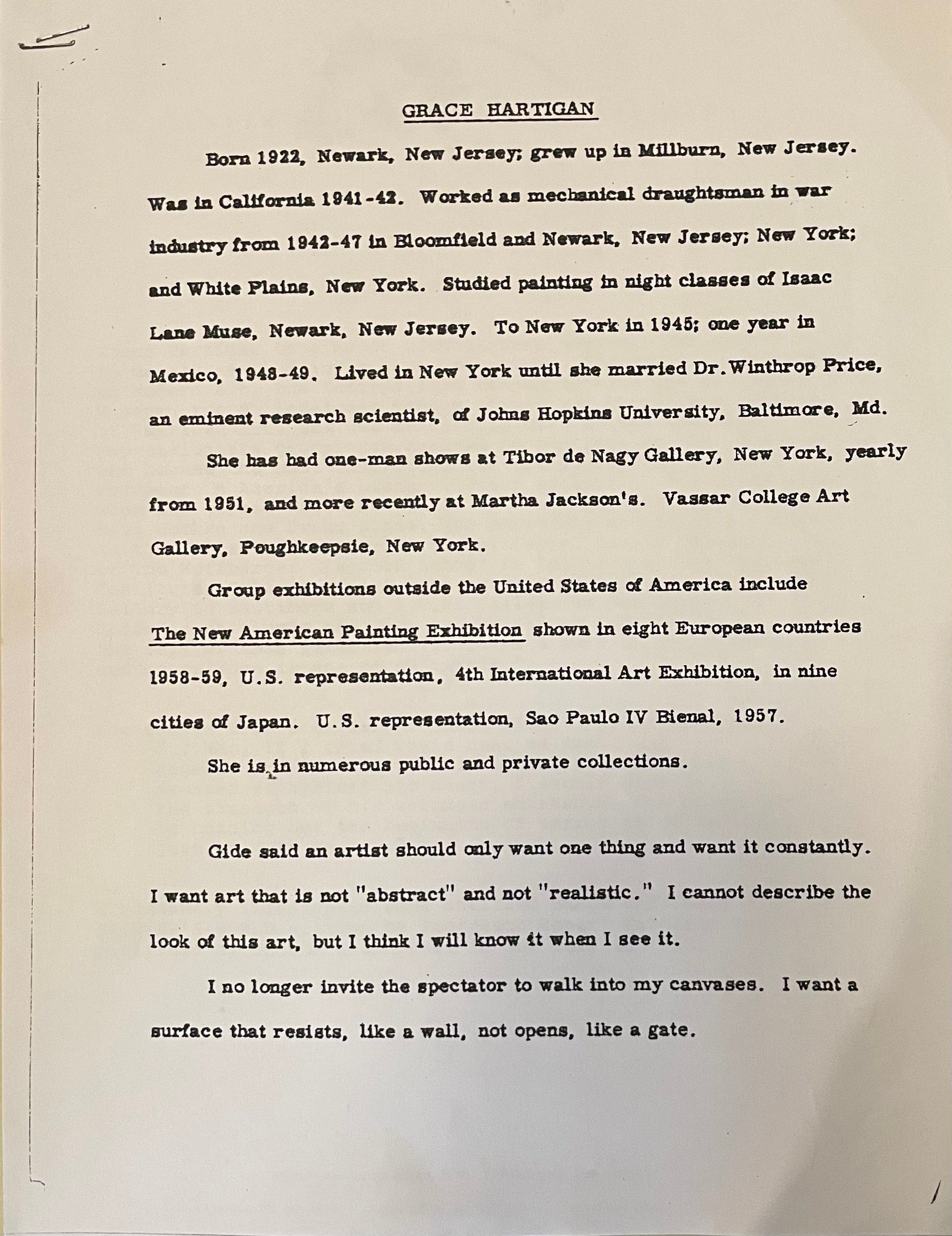 Two copies of this description have the same first page, which talks about Grace Hartigan's life and achievements, but only one includes the second page, which continues the description. Date unknown.Acquisition