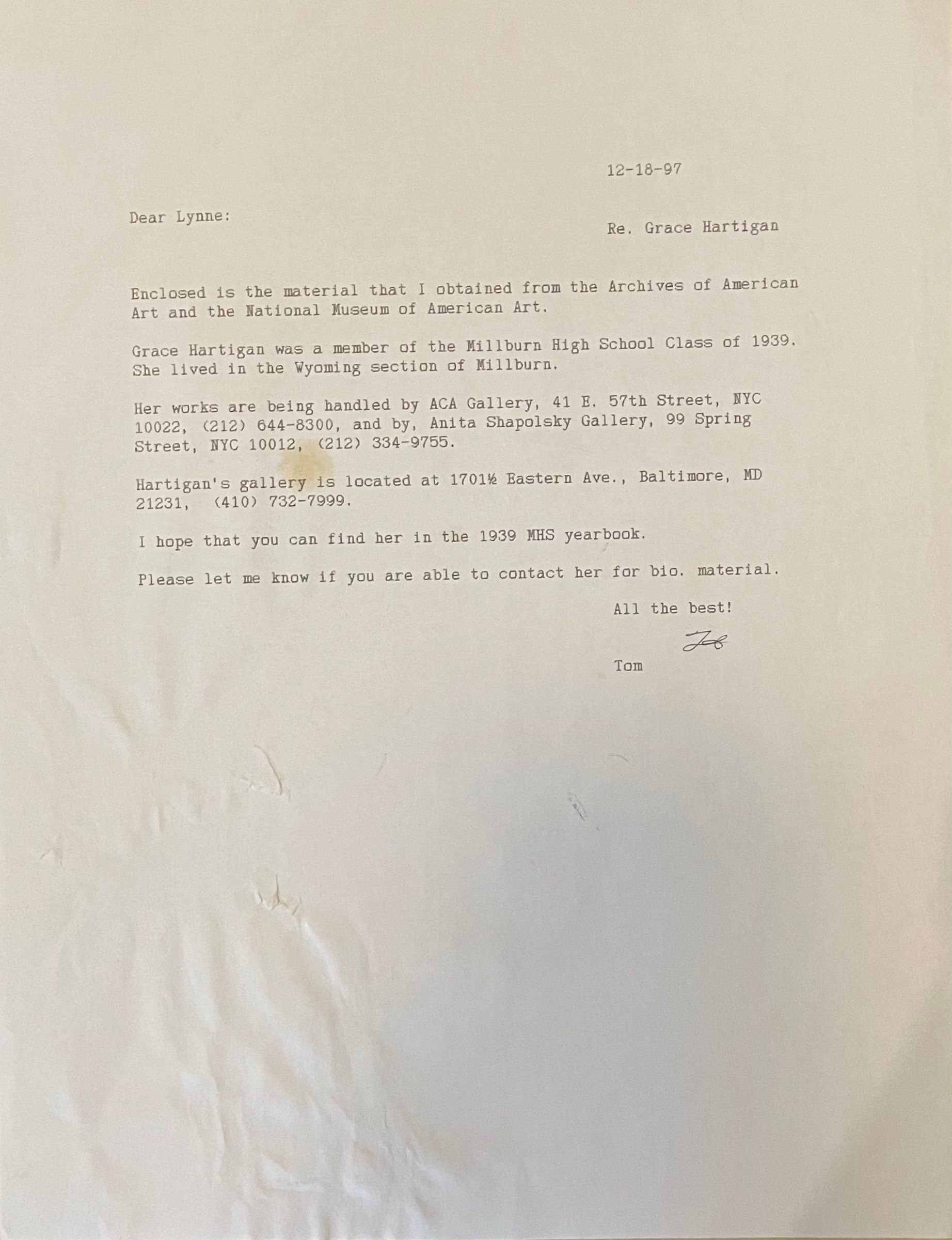 Letters between Lynne Ranieri (curator of the Millburn-Short Hills Historical Society) and Thomas Collins trying to find information about Grace and her location at the time.