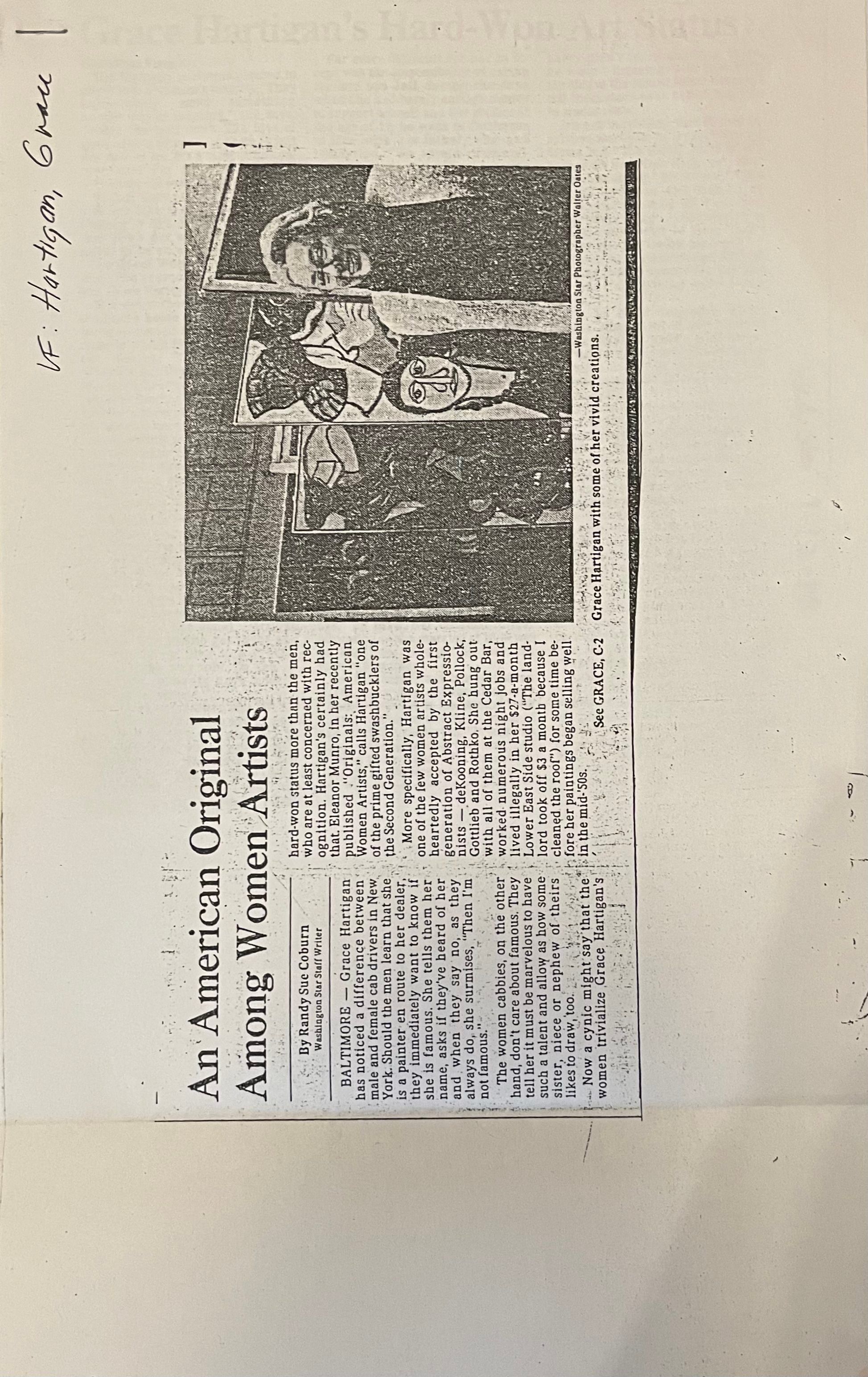 The Washington Star articles "An American Original Among Women Artists" and "Grace Hartigan's Hard-Won Art Status" by Randy Sue Coburn discuss how Hartigan appreciates her recognition as an important abstract expressionist female artist, but also note that she understands that she is not the only one.