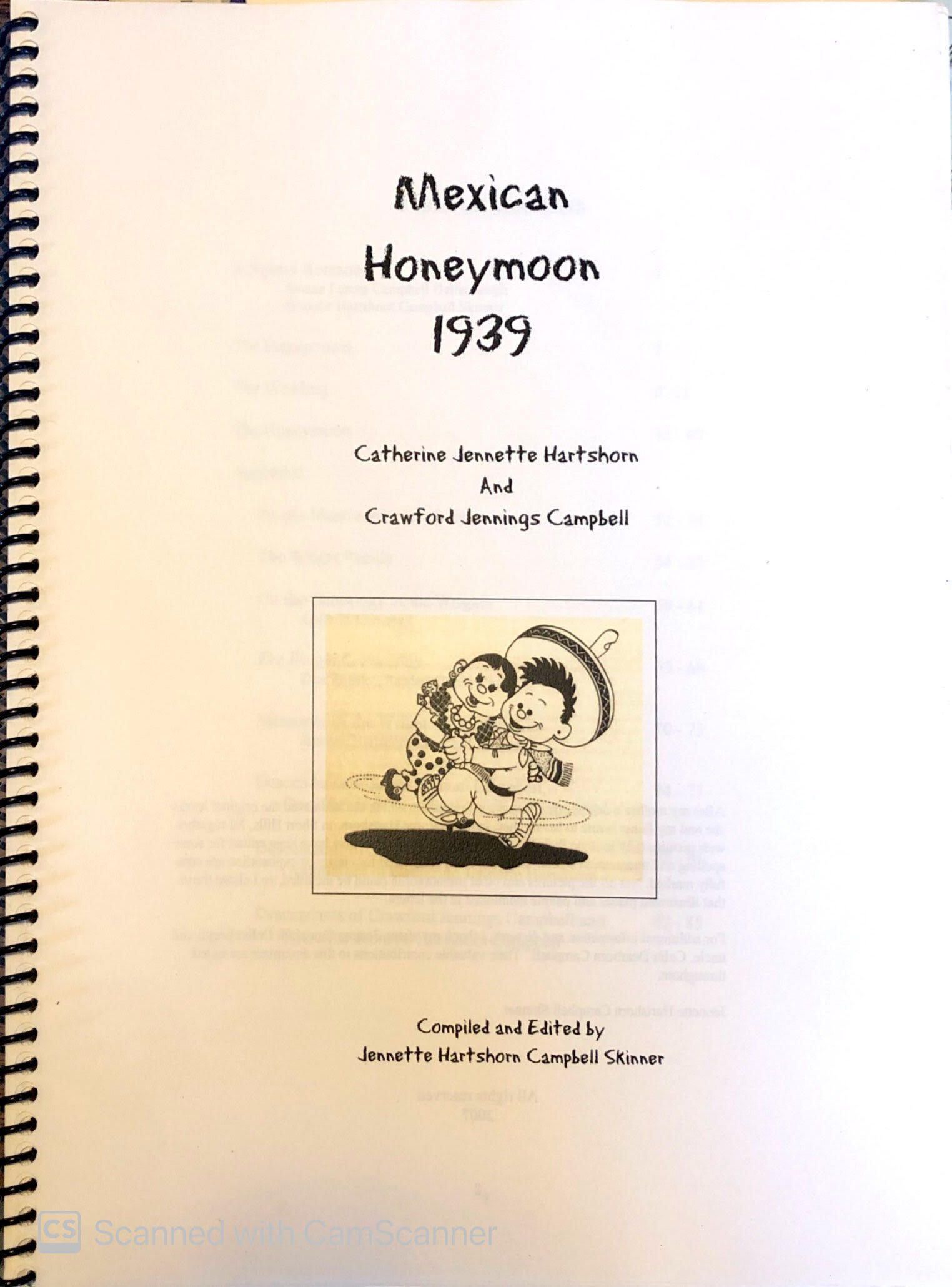 Book entitled "Mexican Honeymoon 1939," compiled and edited by Jennette Hartshorn Campbell Skinner. Compilation of letters written by newlywed couple Catherine Jennette Hartshorn and Crawford Jennings Campbell to Hartshorn's mother. Recent updates/photos of family tree/family attached the back of the book.Acquisition