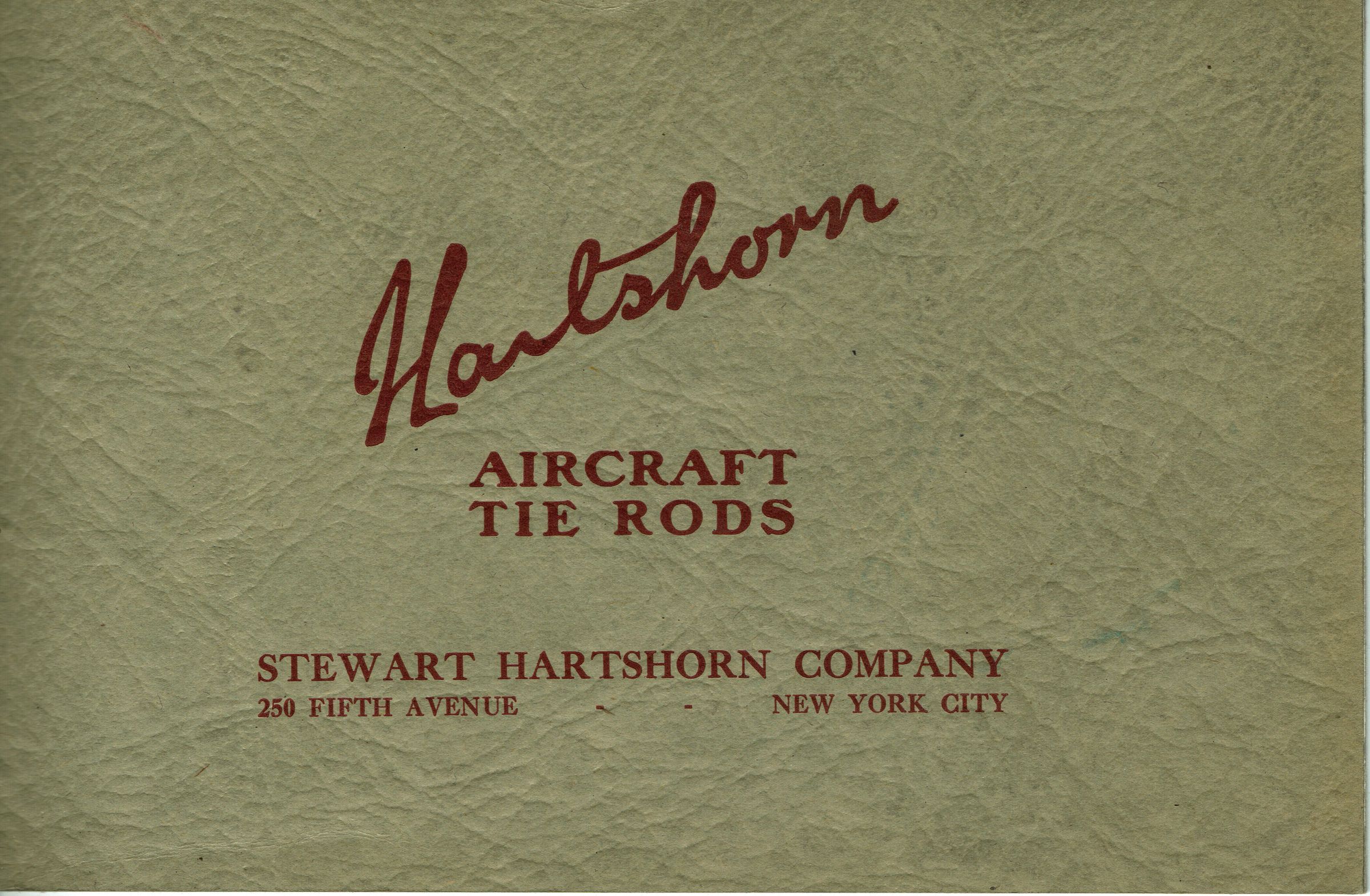 15-page Hartshorn advertising catalog for his aircraft tie rods. Contains A Brief History of the Development of Aircraft Tie Rods and specifications for tie rods. Illustrated with B&W photographs. Copy #2 of catalog.Collection