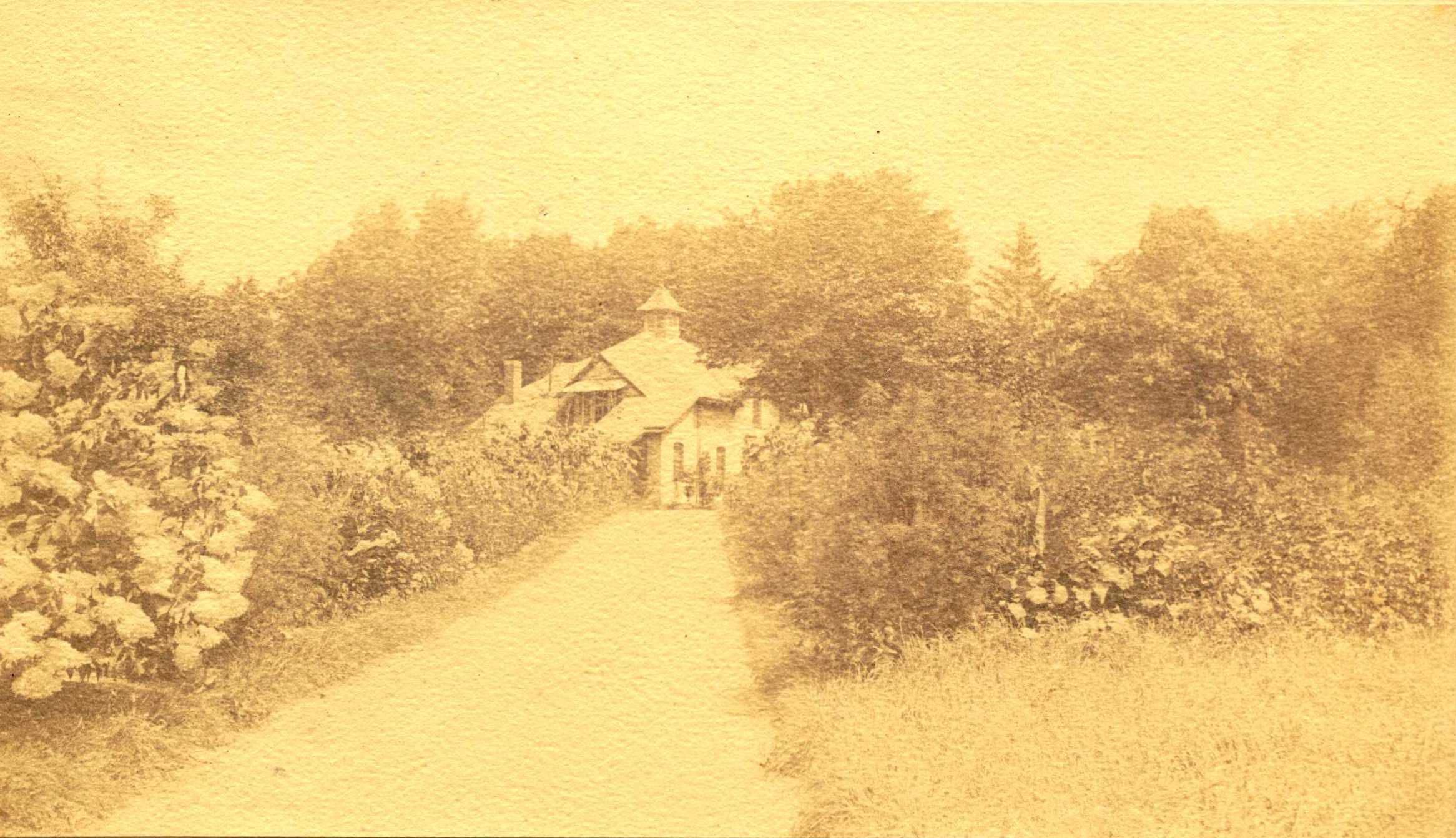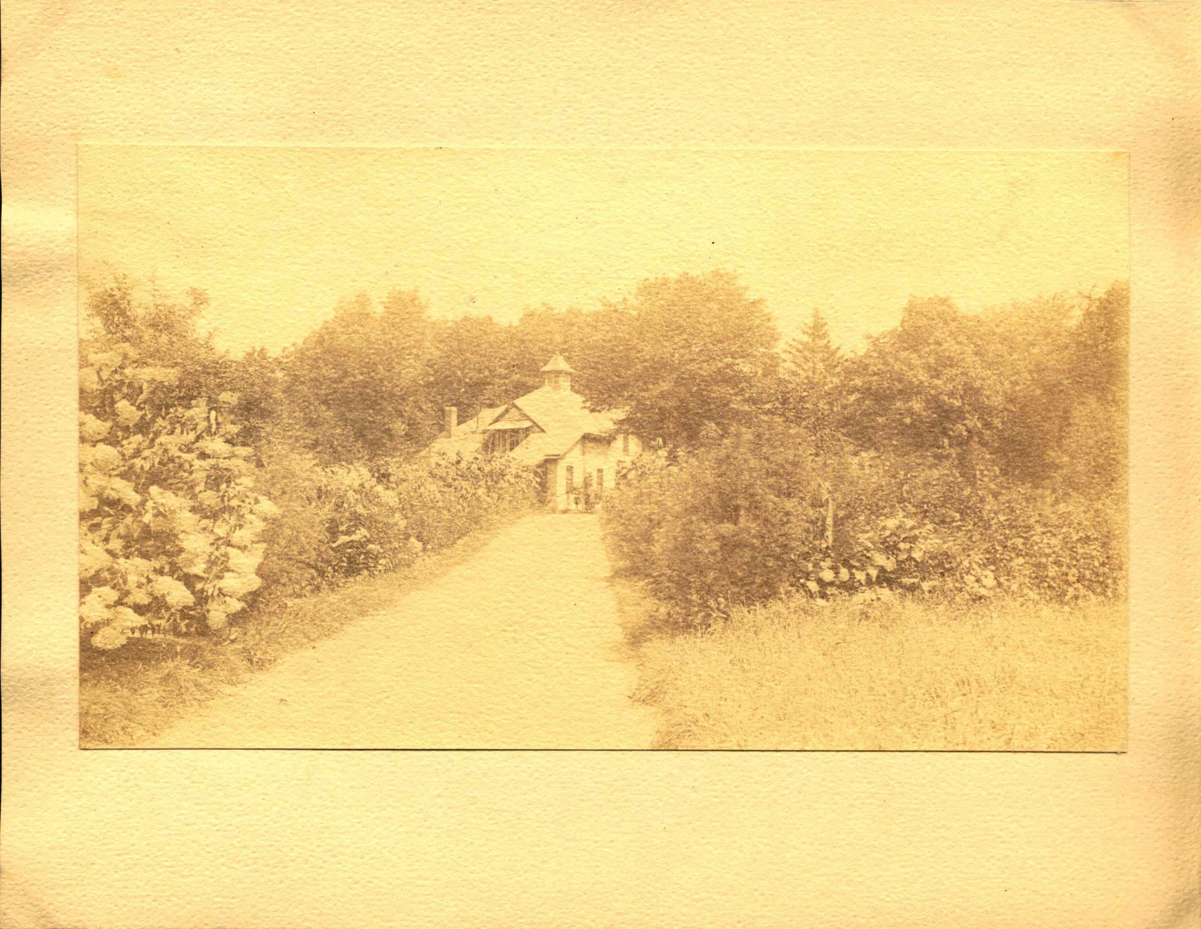 Image #7. Photograph of a small house at the end of a garden path. Two prints in the album. House has not been identified. Photograph emphasizes the secluded, yet carefully planned, nature of homes in the Short Hills area in the early 1900s.Collection