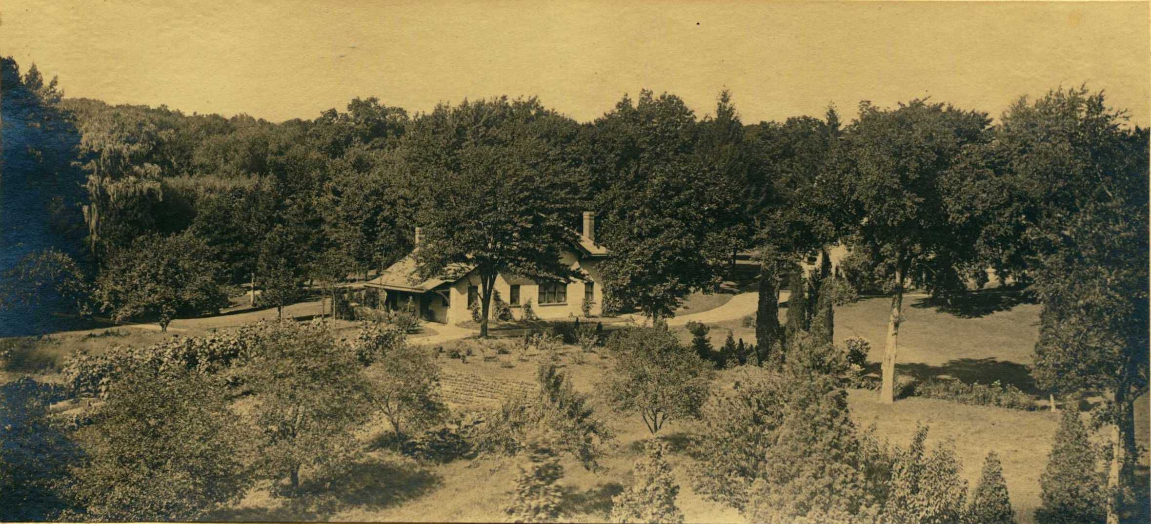 Image #8. Photograph of house at the end of a garden path as viewed from a distance. Note the dirt roads. Photograph emphasizes the relationship between the house and the landscape. Hartshorn oversaw the development of his properties to ensure that each house had a proper vista. The photograph emphasizes his ideal.Collection