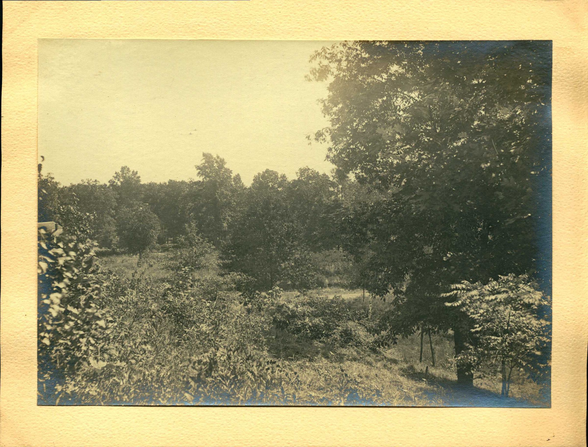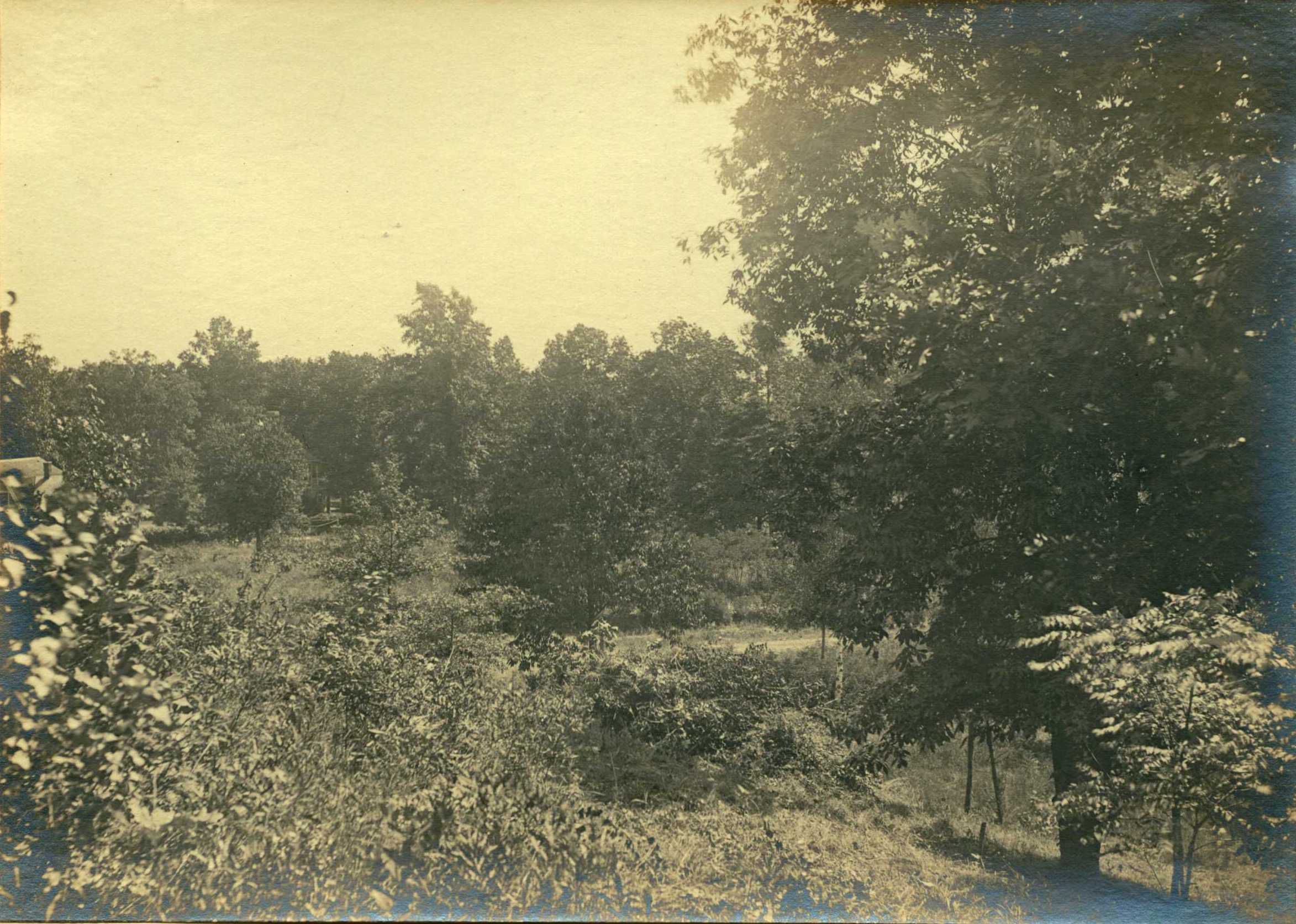 Image #26. Photograph emphasizes the untouched nature that would be viewed from houses in Short HIlls. The landscape dominates the photograph with the only signs of suburban development in the fragment of the house at the far left center of the photograph.Collection