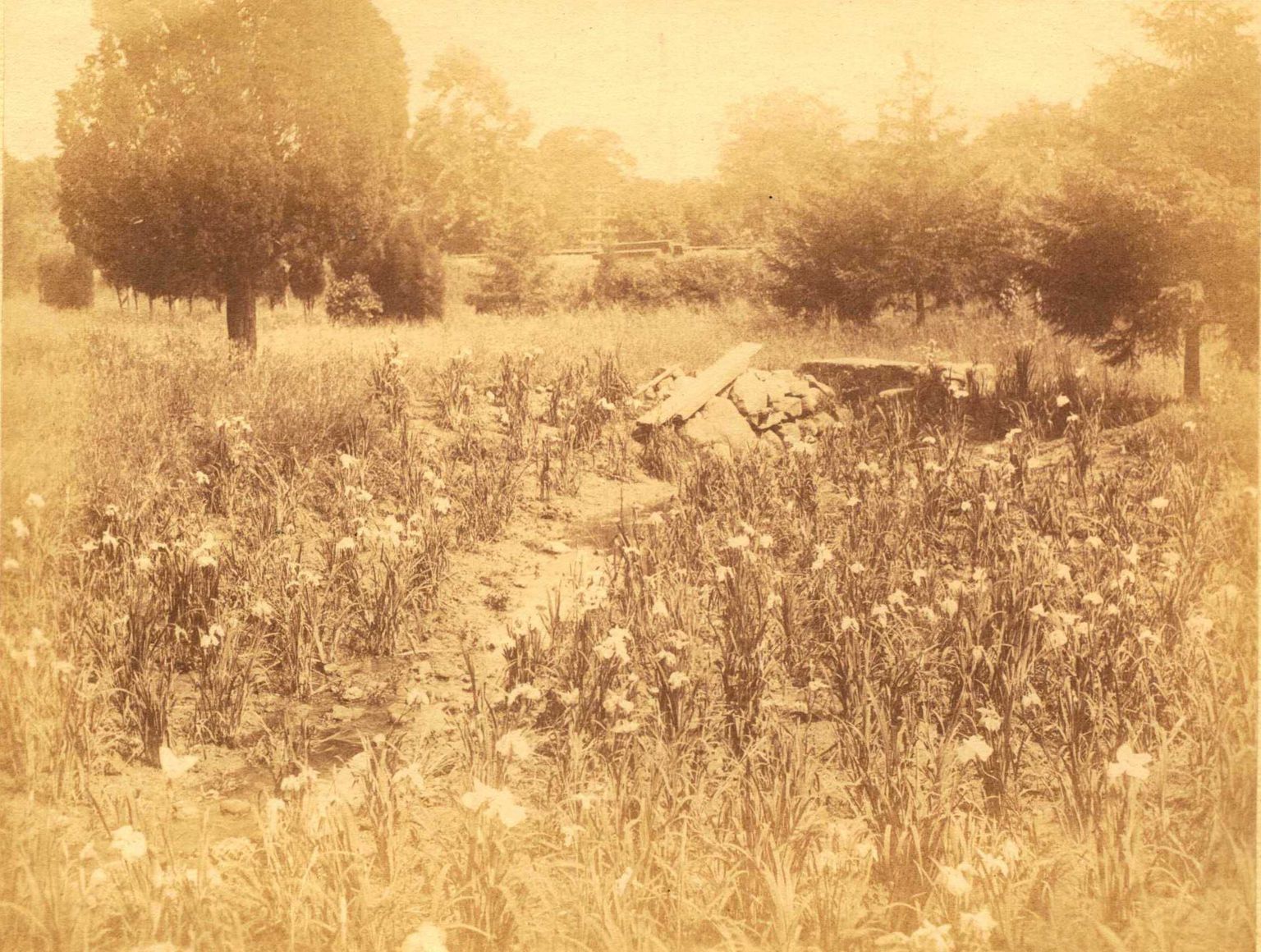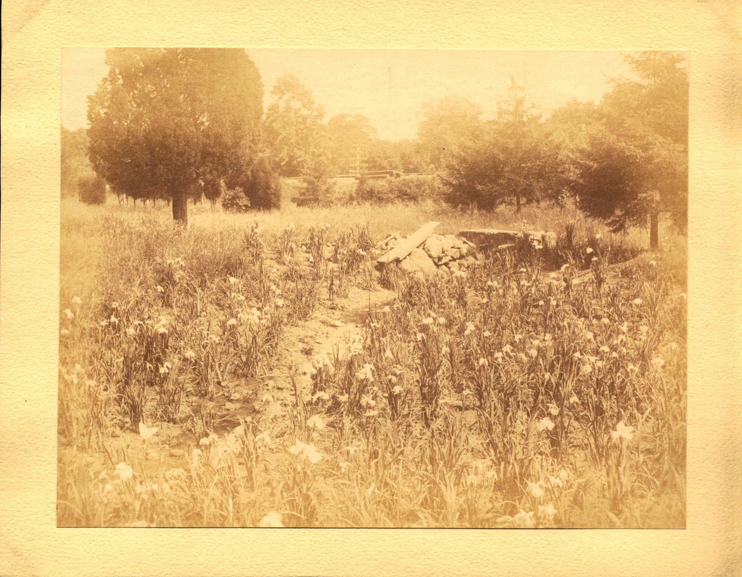 Image #12. Close up photograph of portion of a stone wall and wildflowers with the railroad tracks in the distance.Collection