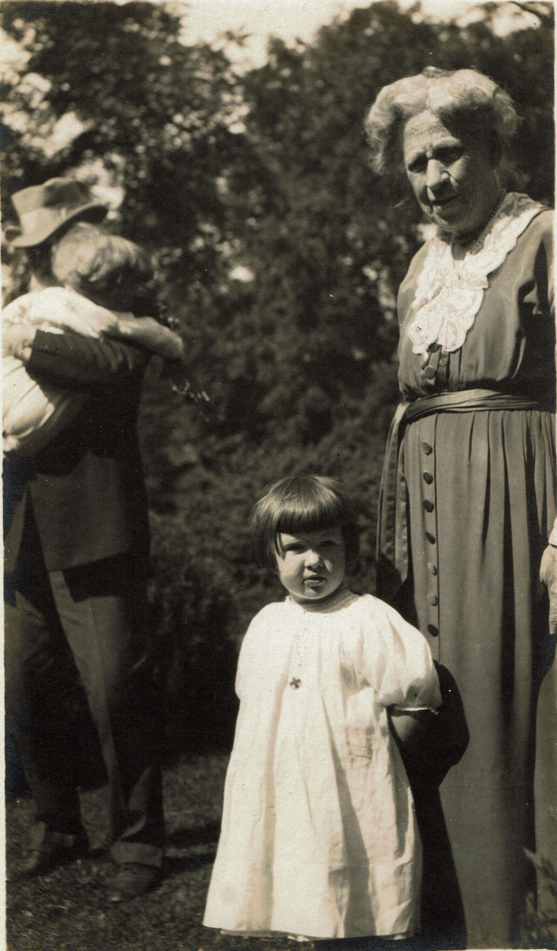 Photograph of Catherine Jennette Hartshorn and her grandmother Joanna Randall Hartshorn in 1920. Stewart W. Hartshorn in the background holding his grandson Stewart "Jr." (Stewart Hartshorn III).Collection