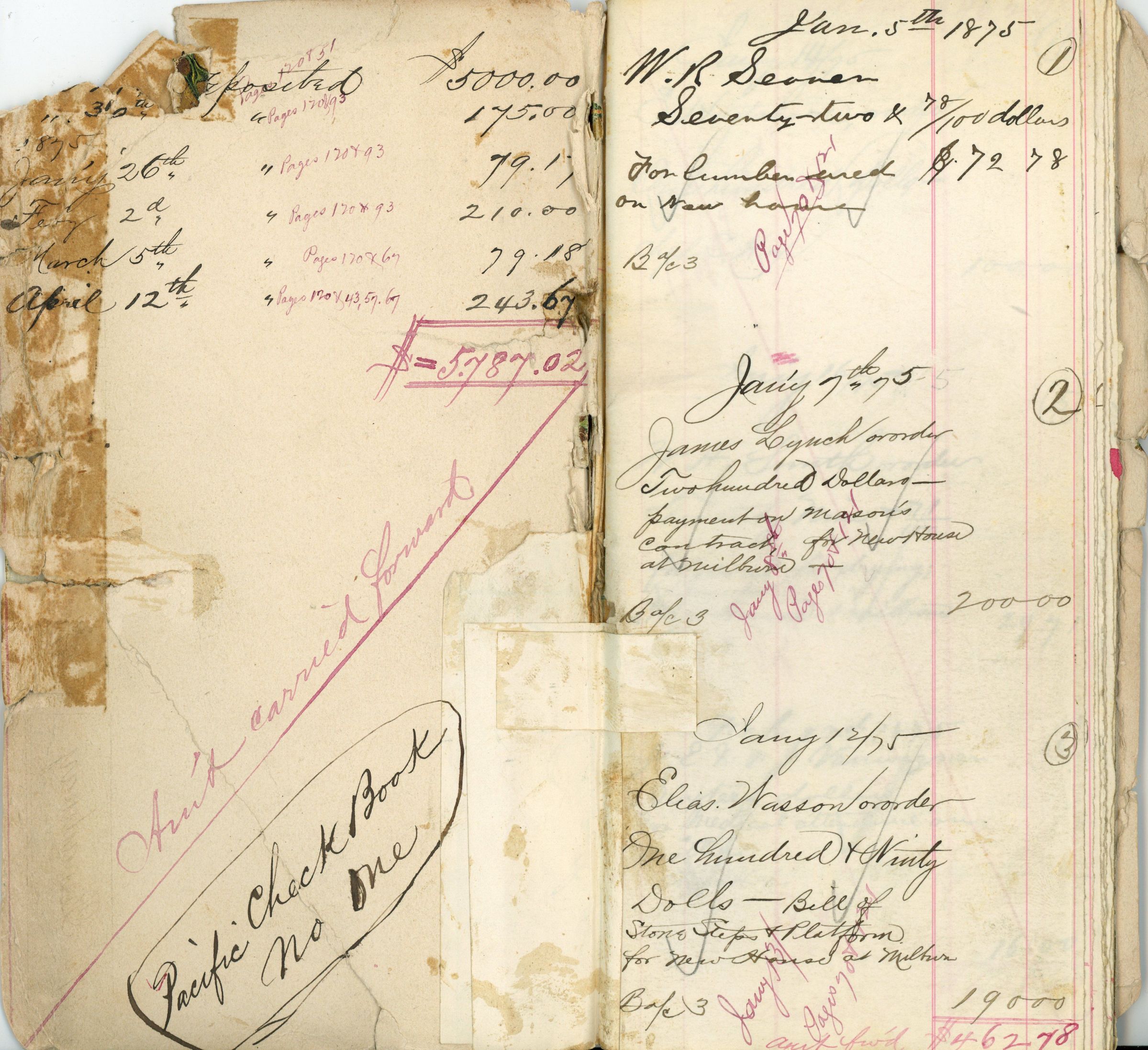 Forty-Six page handwritten check book accounting for checks written from the Pacific Check Book Number One from January 1875-October 1875. Checks written appear to primarily cover expenses relating to the construction of Hartshorn's first residence in Short Hills. See: 2022.010.009.Collection