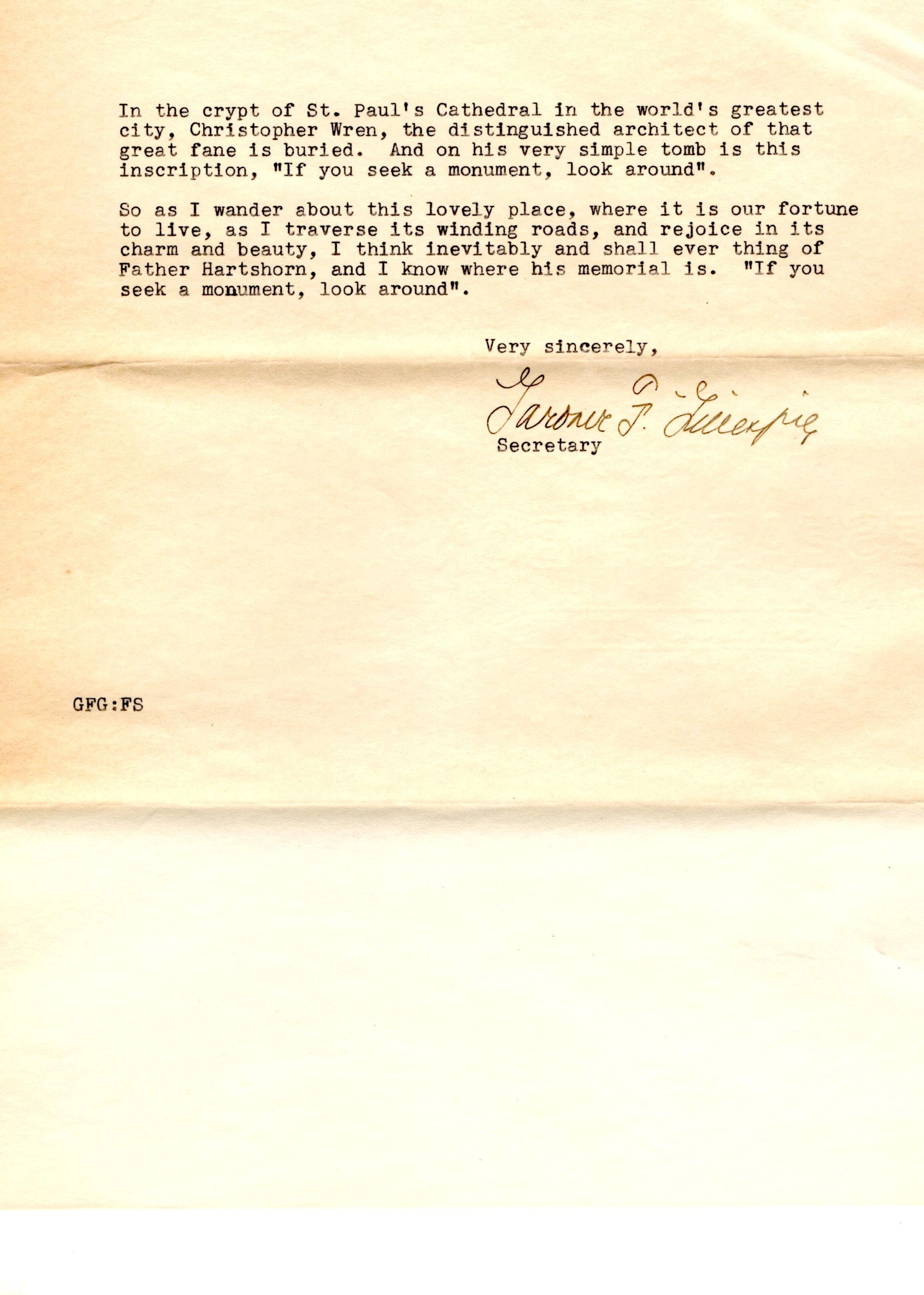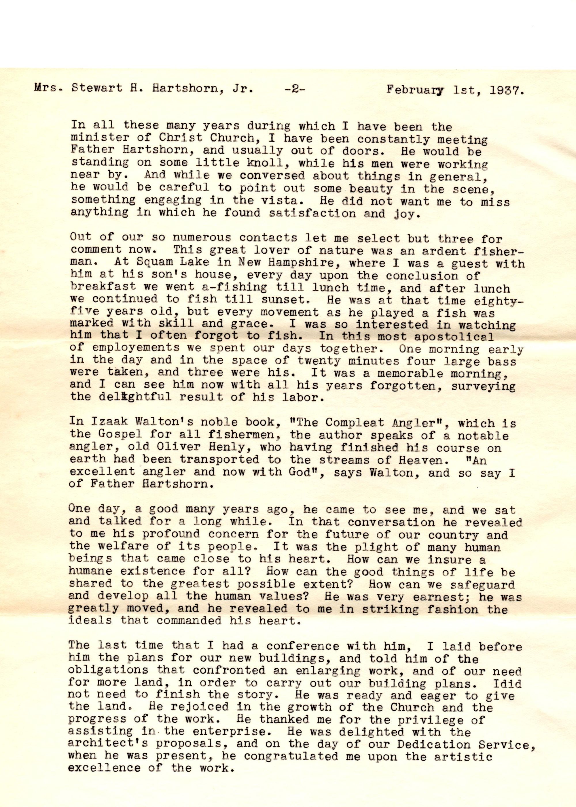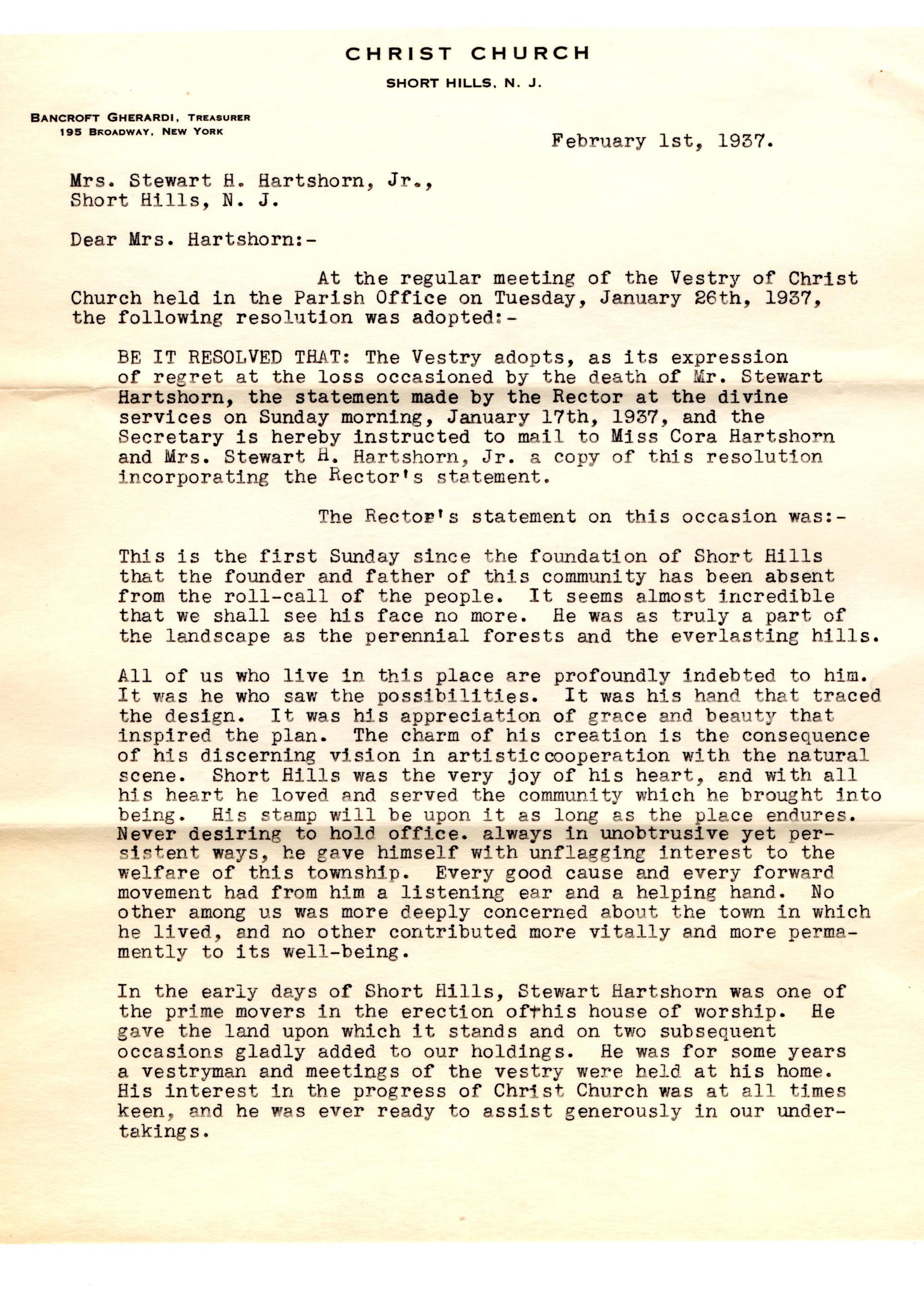 Three-page testimonial letter issued from the vestry of Christ Church to send Cora Hartshorn and Mrs. Stewart H. Hartshorn a copy of the Rector's statement issued on Sunday, January 17, 1937.Collection